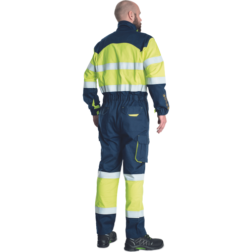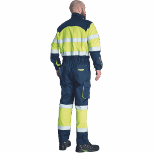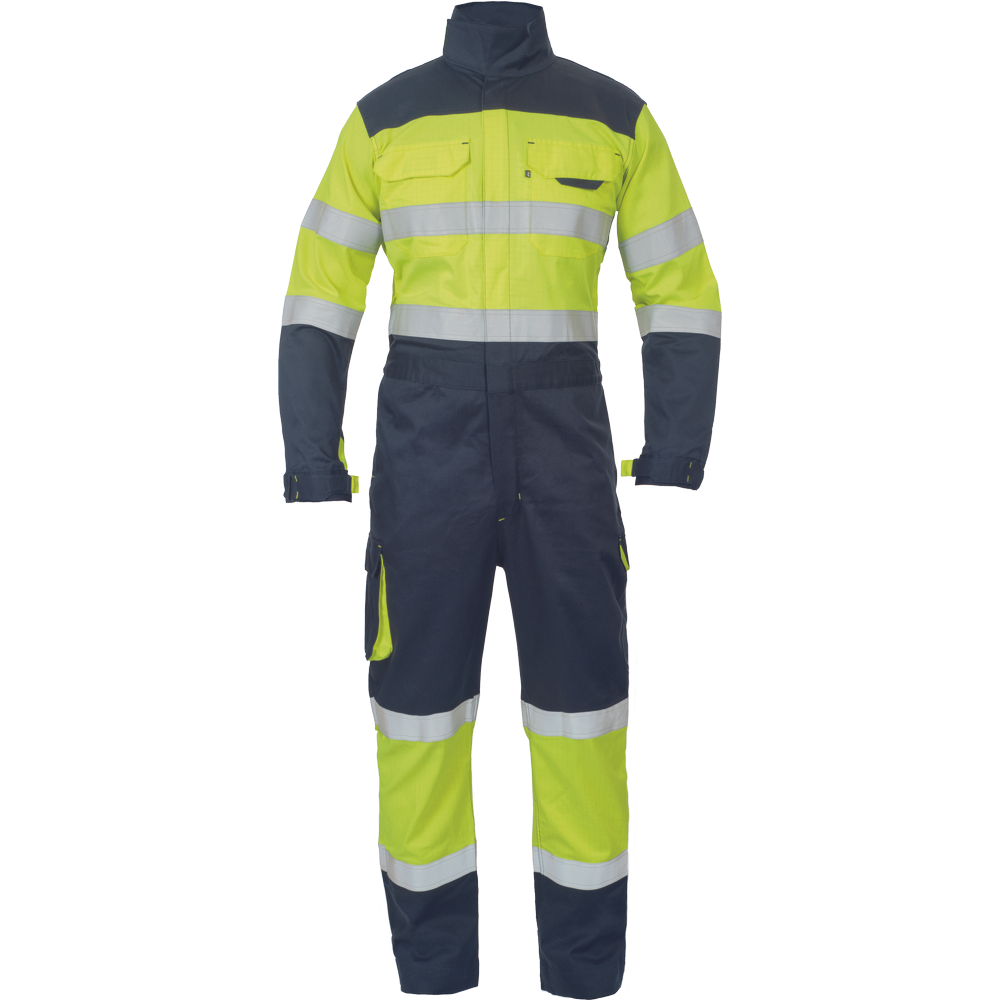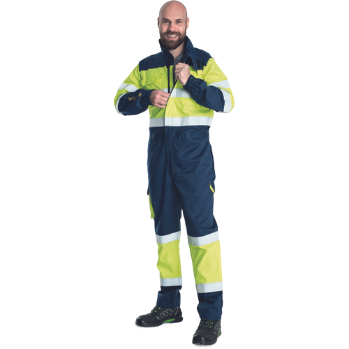 – moški HI-VIS kombinezon iz več materialov z elastičnim pasom – zadrga se zapenja z velcro zavihkom – 2 stranska žepa – 2 stegenska žepa z velcro zavihkom – 2 prsna žepa z velcro zavihkom – 2 zadnja žepa z velcro zavihkom – odsevne 5 cm črte okoli telečk, rokavov in bokov – elastični rokavi z velcro nastavitvijo – možnost podaljšanja dolžine nog