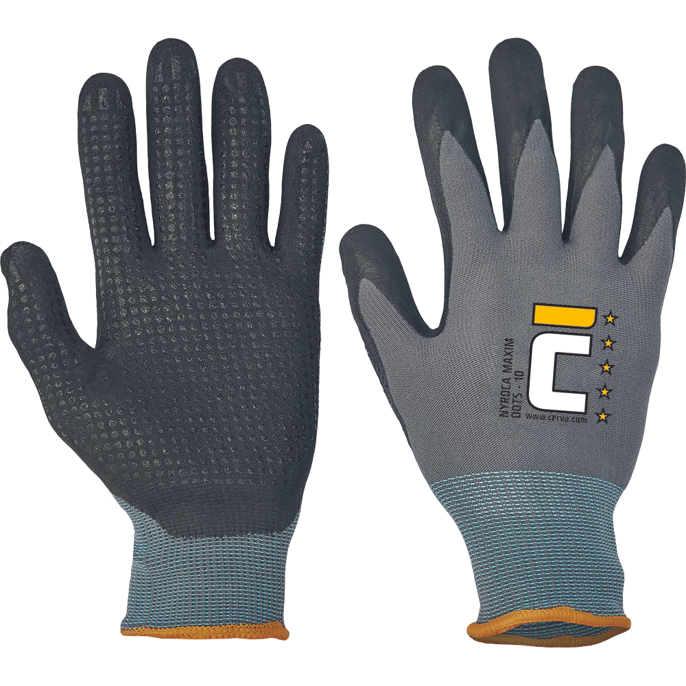 – rokavice iz najlona/lycra jerseyja, prepojene z mikropornim nitrilom – odlična prepustnost – nitrilne pike na dlaneh in prstih – zelo dober oprijem v suhem, mokrem in mastnem okolju