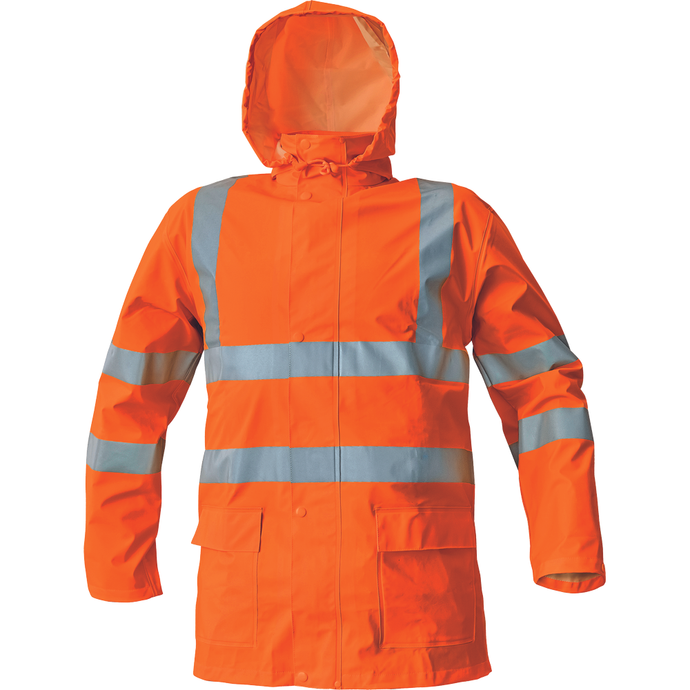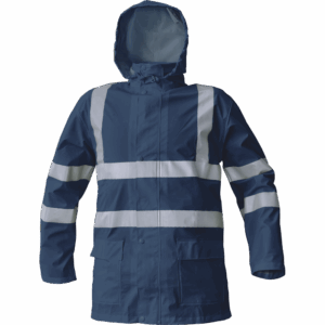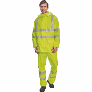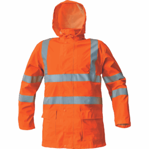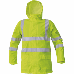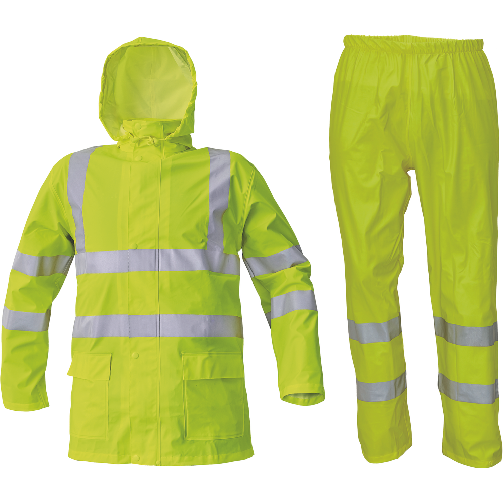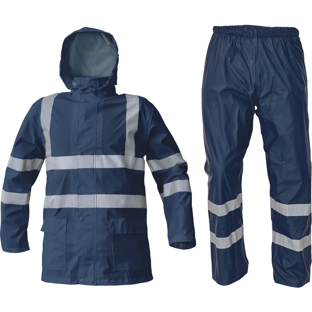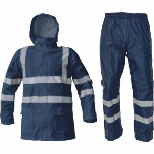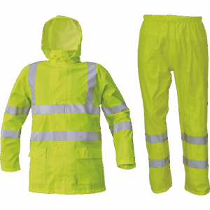 – nepremočljiv in vetru odporen komplet jakne in hlač – ¾ plašč s kapuco v ovratniku – hlače z elastičnim gumijastim pasom – odsevne črte na jakni okoli prsi, bokov, rokavov in čez ramena – odsevne črte na spodnjem delu nog, jakna z 2 žepoma s poklopcem spredaj – spodnji rob rokavov se nastavlja s popperji – različica HI-VIS v rumeni in oranžni barvi