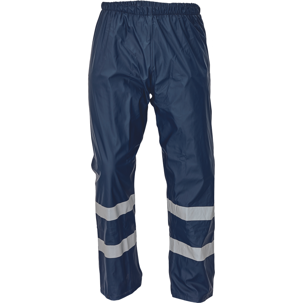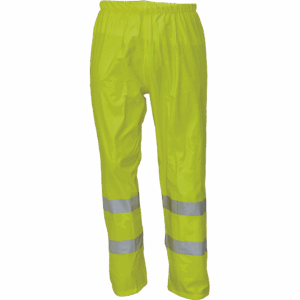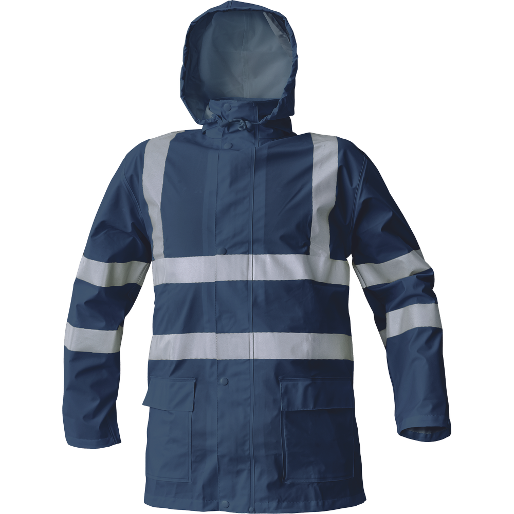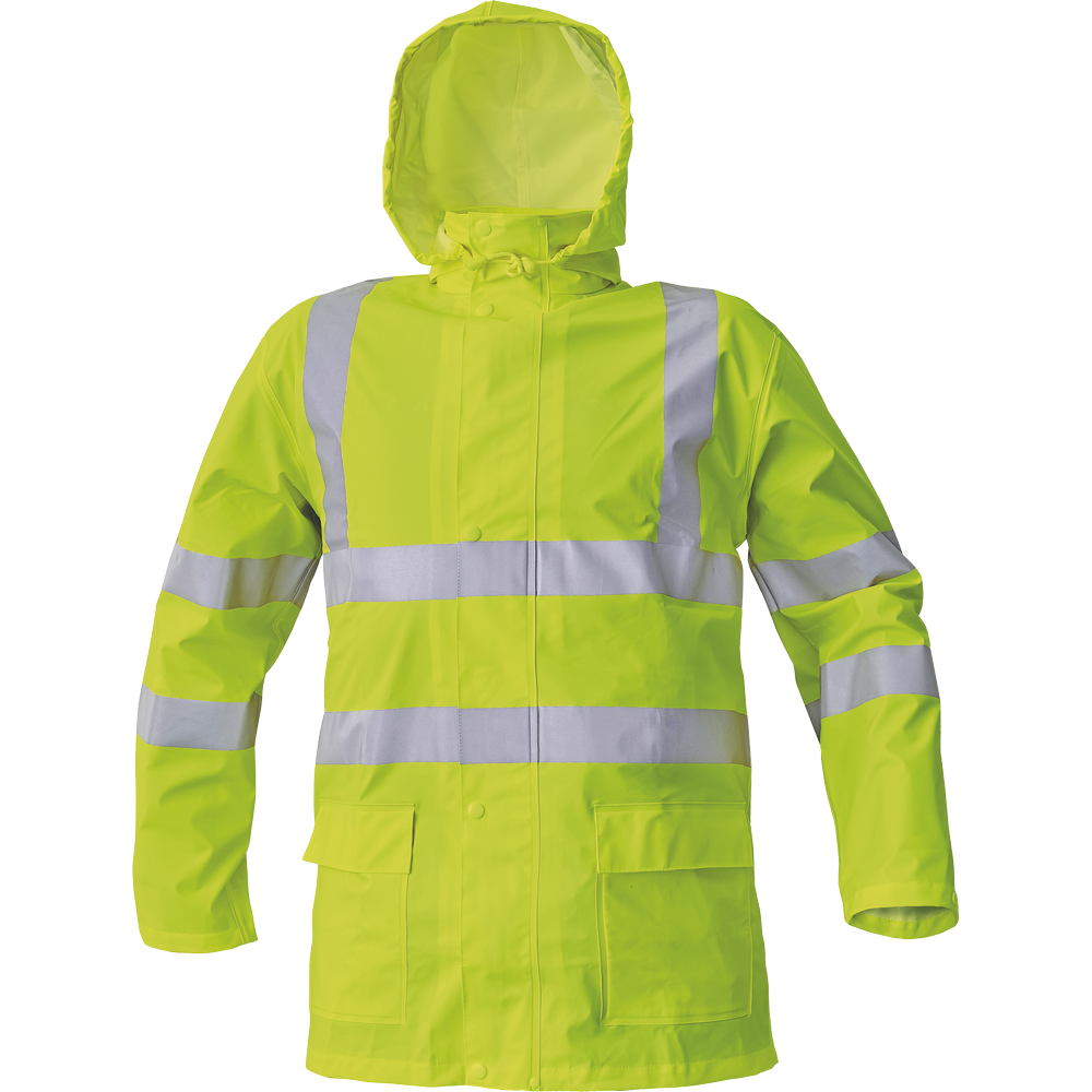 – nepremočljiv in vetru odporen komplet jakne in hlač – ¾ plašč s kapuco v ovratniku – hlače z elastičnim gumijastim pasom – odsevne črte na jakni okoli prsi, bokov, rokavov in čez ramena – odsevne črte na spodnjem delu nog, jakna z 2 žepoma s poklopcem spredaj – spodnji rob rokavov se nastavlja s popperji – različica HI-VIS v rumeni in oranžni barvi