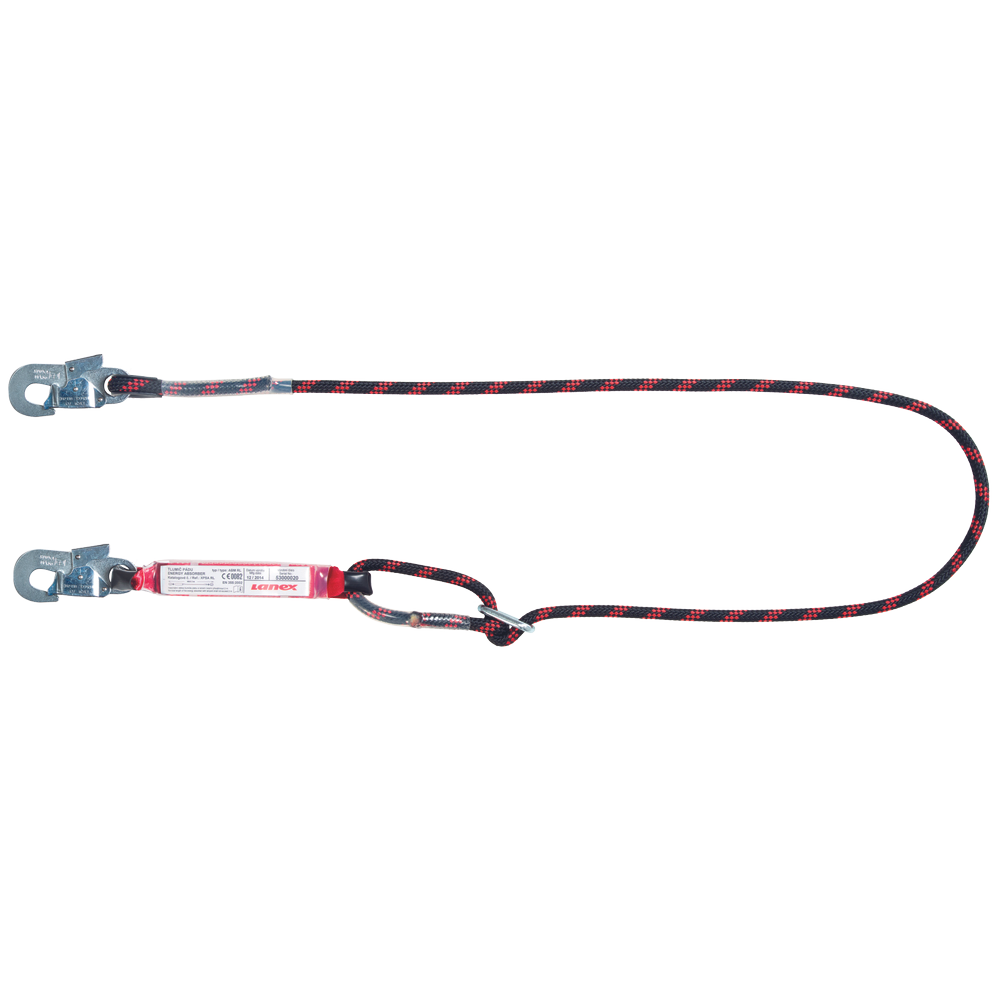 amortizer ABM RL z povezovalnimi sredstvi LB 10 z nastavljivko dolžine; specifikacije: PA trak in PA pletena vrv Ø 12 mm; dimenzije blažilnika 160 x 35 x 45 mm; dolžina sistema 1,8 m; možnost povezovanja z dodatnim karabinom; izpolnjuje standard EN 355