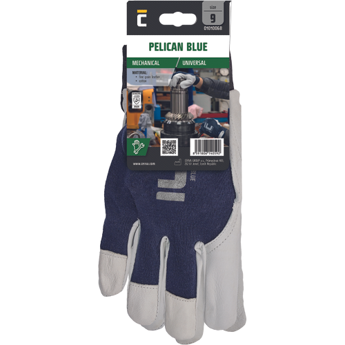 – šivane rokavice iz finega ovčjega usnja na dlani – hrbtna stran iz modre bombažne tkanine – manšeta na velcro