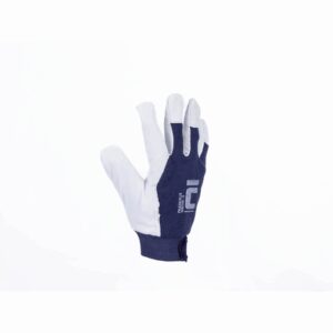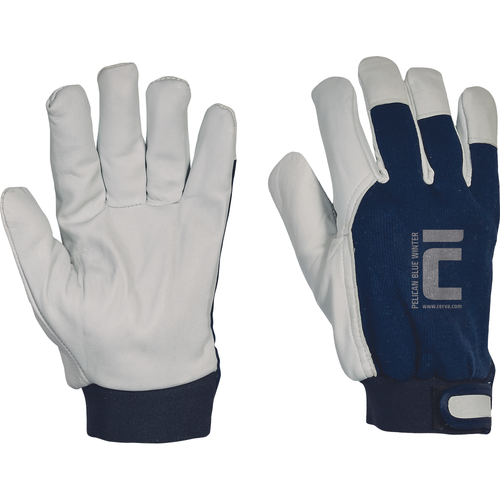 – Termoizolirane šivane rokavice z dlanjo iz finega ovčjega usnja – hrbtna stran iz modre bombažne tkanine – manšeta na velcro