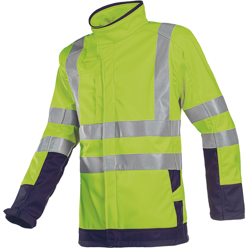 – moška večplastna softshell jakna HI-VIS z zaščito ARC – negorljiva in antistatična – vodoodporna in hladna zaščita – zapiranje na zadrgo pod zavihkom – 1 vstavljen prsni žep z zadrgo – 2 stranska žepa – 1 notranji žep – negorljive odsevne črte po telesu, rokavih in čez ramena – zoženje rokavov z velcro zapenjanjem