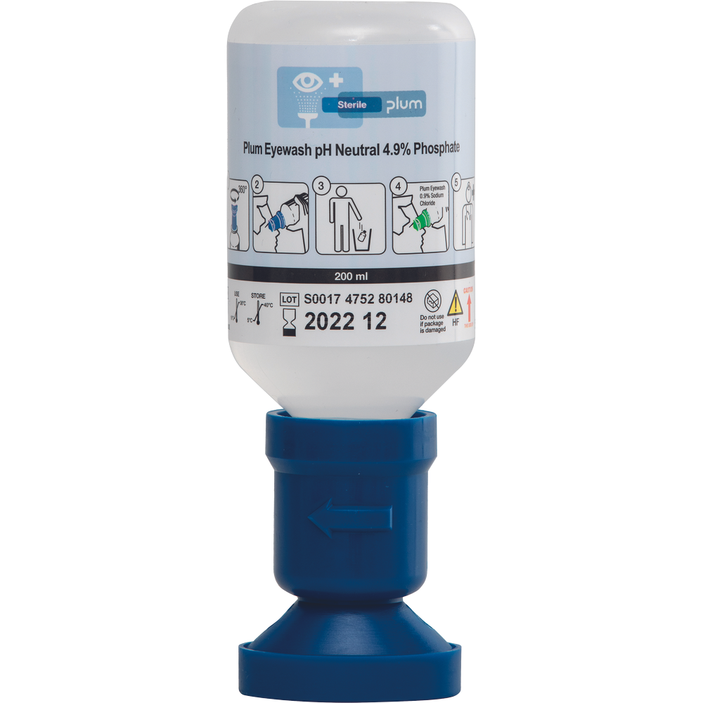 Plastična steklenica s 4,9 % sterilno fosfatno puferno raztopino, ki hitro nevtralizira kisline in baze; lahko se uporablja samostojno ali kot nadomestna polnitev za prhe za oči in škatle; steklenico je enostavno nositi v posebej zasnovanem pasu, kompletu prve pomoči, orodjarni itd.; dobavljeno z zaščitno kapico; vsebina 200 ml pH nevtralne očesne vode.