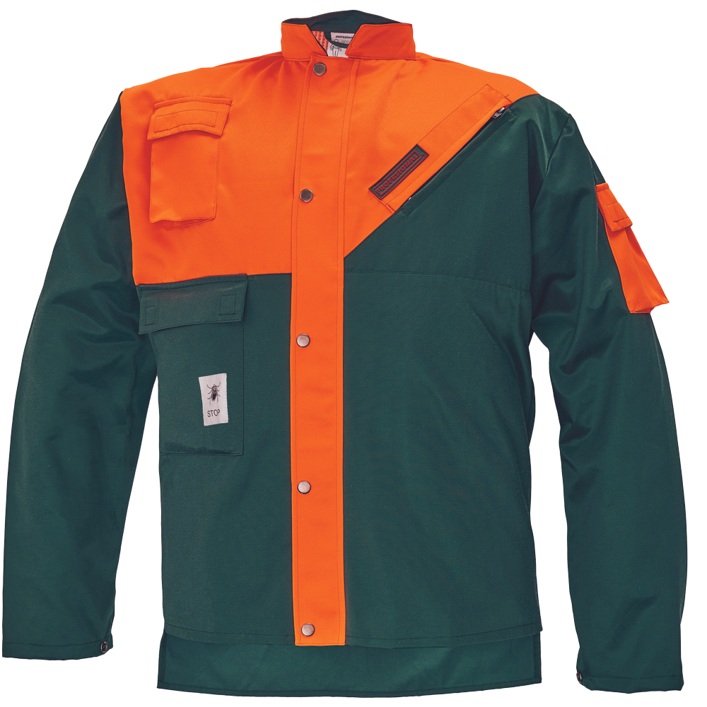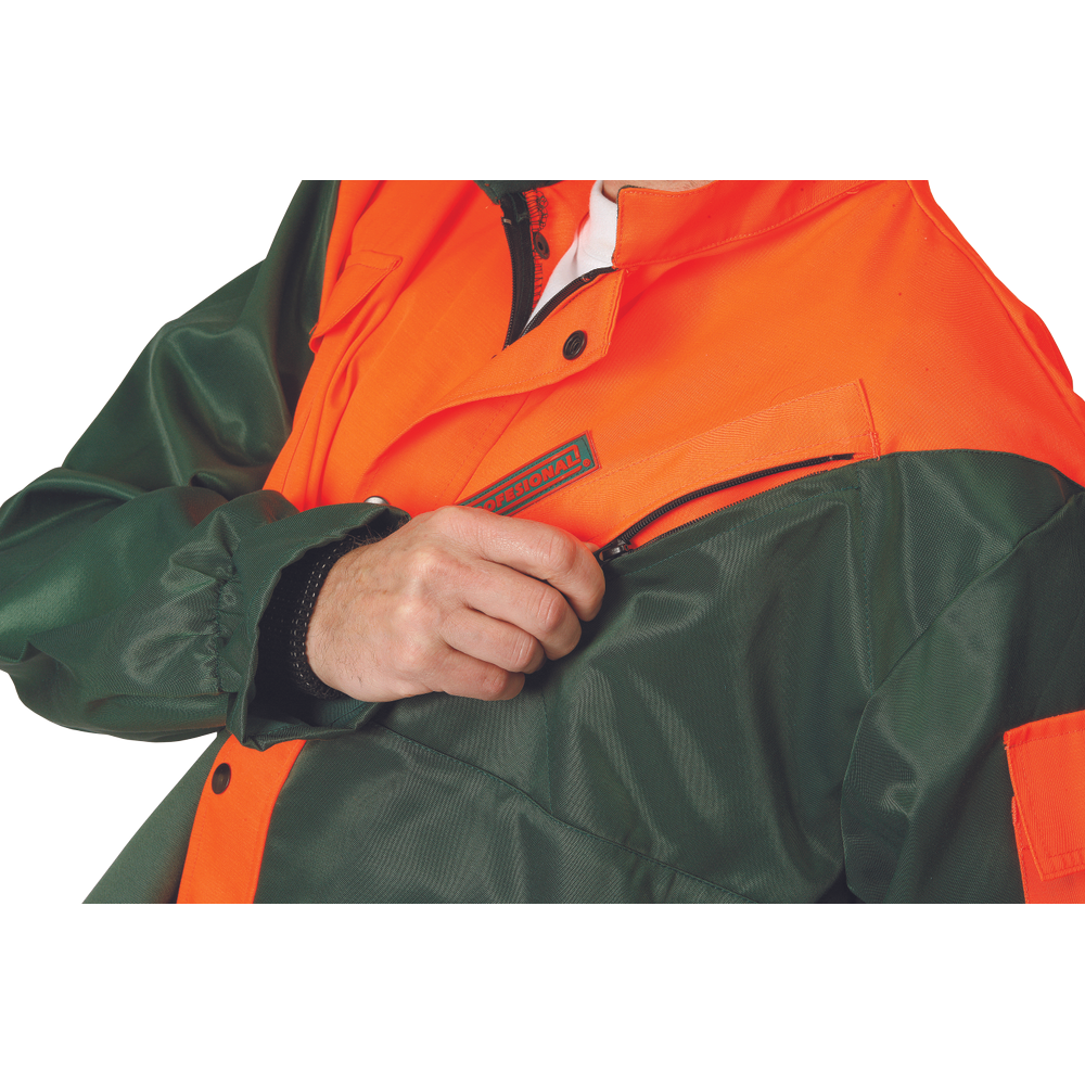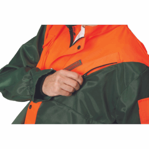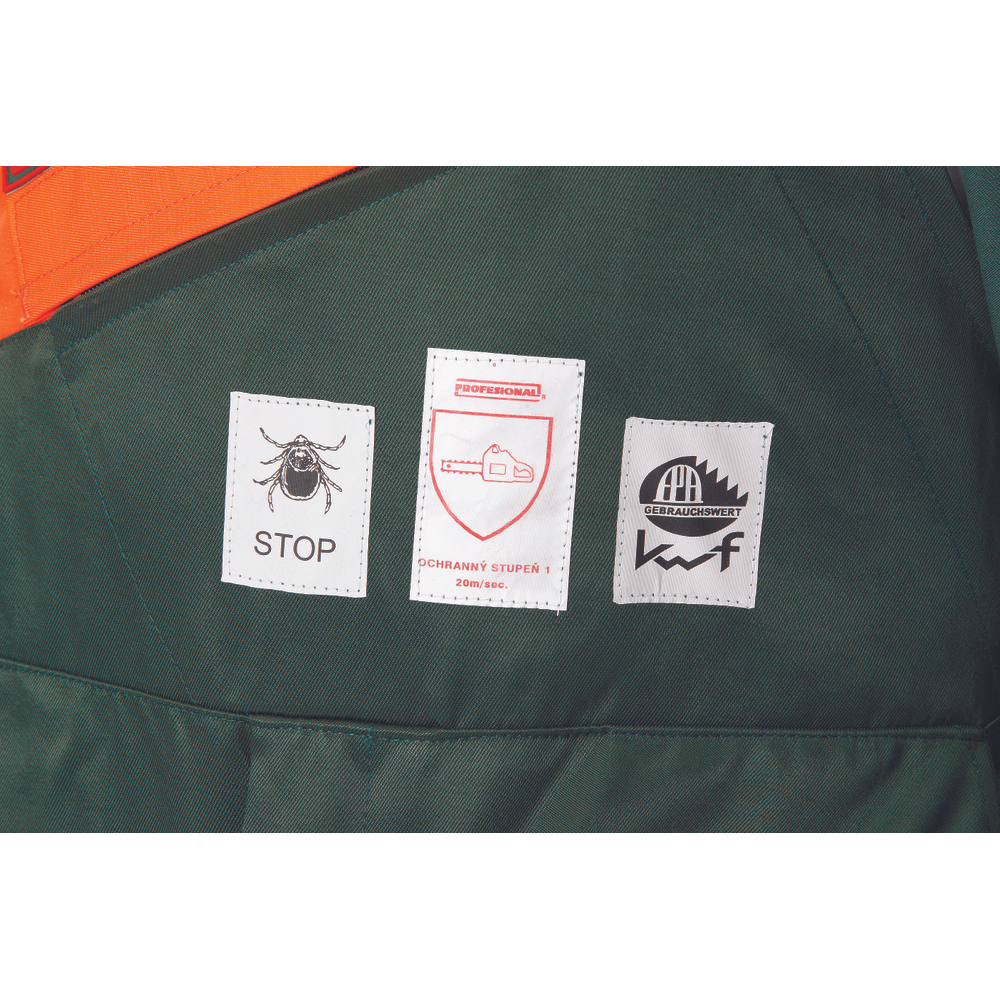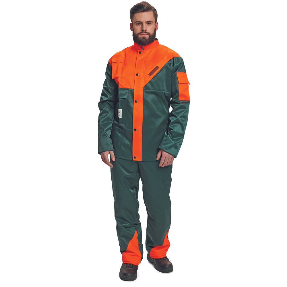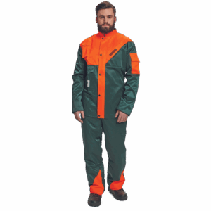 – moško zaščitno oblačilo za drvarje z motorno žago – komplet jakne in hlač z naramnicami – kratek ovratnik s flisom na notranji strani – levi prsni žep z zadrgo – desni žep za mobilni telefon z zavihkom na velcro – žep na rokavu – zadrga z zatičem in zavihkom – rokavi z elastičnimi notranjimi manšetami – podaljšani zadnji del – zračenje na hrbtu – površinska obdelava proti klopom – certificirano kot zaščitno oblačilo za uporabnike ročnih motornih žag razreda 1 – hitrost verige 20 m/s.