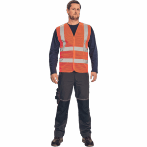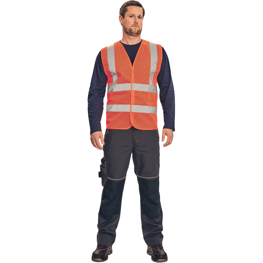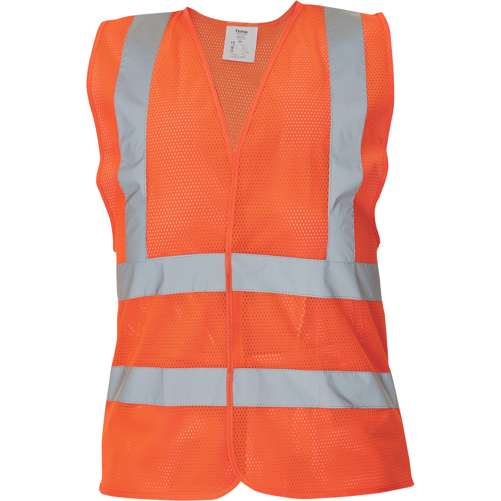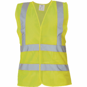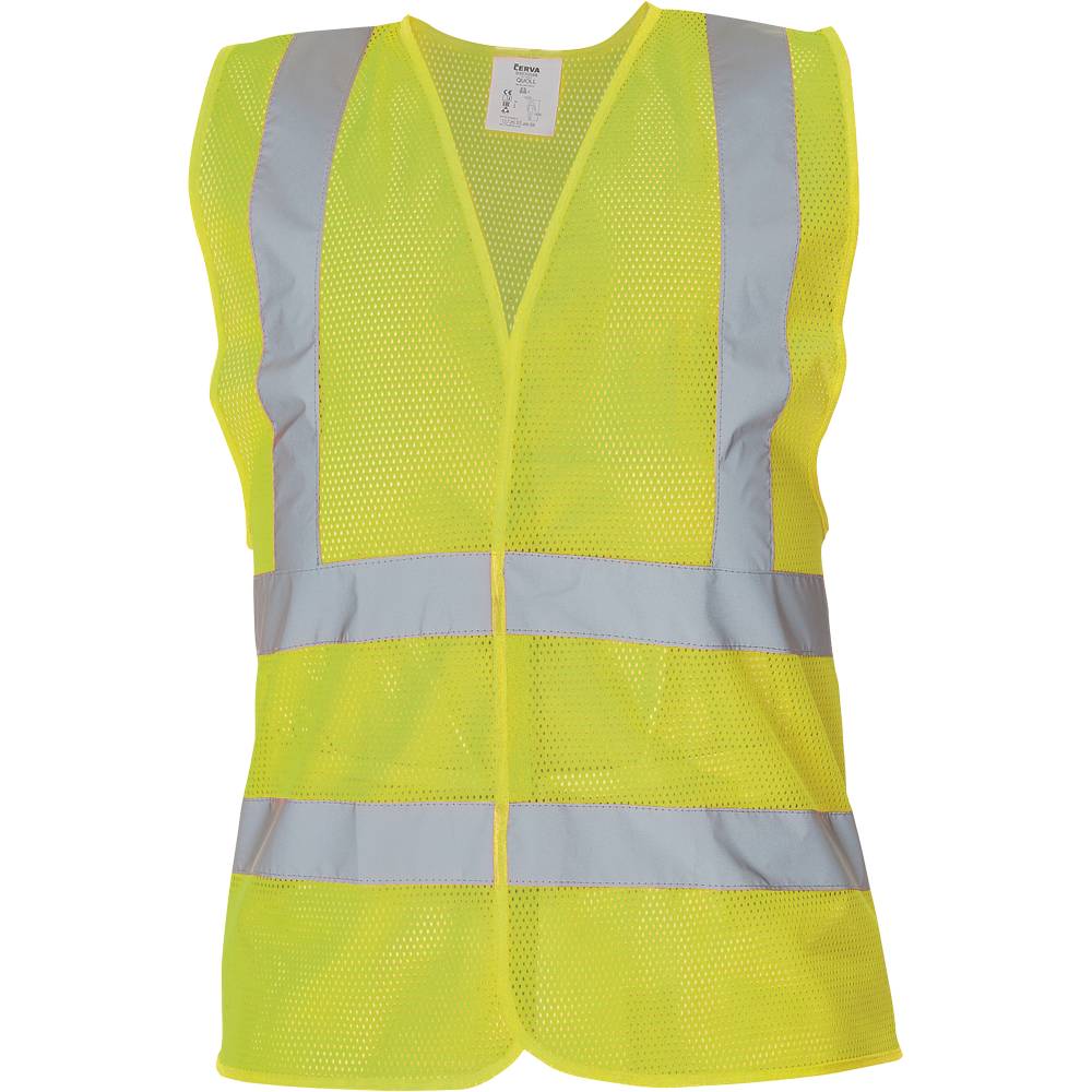 – Svetlobni telovnik HI-VIS iz zračne mrežaste tkanine za vročo sezono – 5 cm odsevne črte na ramenih ter okoli prsi in pasu – zapiranje na velcro