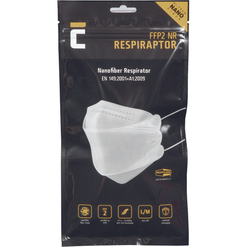 FFP2 NR RespiRaptor boasts a nanofiber filter that has several million pores on one square cm. It prevents viruses, bacteria, smog and dust from entering your mouth and nose. RESPILON® RespiRaptor is a respirator that is capable of blocking harmful substances by using a high-efficiency nanofiber filter filter.