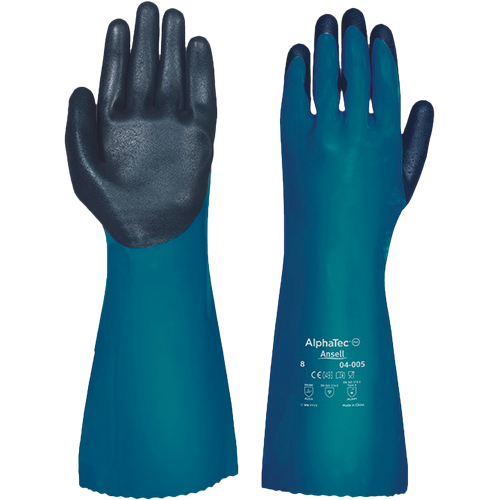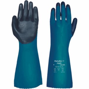 – robustne rokavice iz PVC z dolgimi manšetami, ki zagotavljajo oprijem, udobje in odpornost na kemikalije – povečana zaščita: AlphaTec 04-005 zaščitne rokavice s posebno sestavo iz PVC in nitrila združujejo visoko stopnjo kemične odpornosti*, zaščito pred obrabo in trajno prožnost tudi pri nizkih temperaturah – skladnost z zahtevami za ravnanje s hrano: Te industrijske rokavice brez lateksa ustrezajo tudi normativom FDA in EU za predelavo hrane in higieno, zato so idealne – rokavice za zaščito živil za različne aplikacije Povečano udobje: Zahvaljujoč 13-kanalni brezšivni bombažni zasnovi zagotavljajo odlično – ravnovesje med osebno zaščito in udobjem uporabnika – Izboljšane funkcije: penasta zasnova oprijema teh rokavic AlphaTec ščiti pred oljem in maščobo, hkrati pa ohranja odličen oprijem v mokrih in oljnatih okoljih, njihova dolžina 38 cm/15″ pa dodatno izboljšuje zaščito uporabnika – napredna ergonomija: Poleg tega njihova ergonomska oblika dlani dodatno izboljšuje udobje uporabnika in olajša njihovo dolgotrajno uporabo