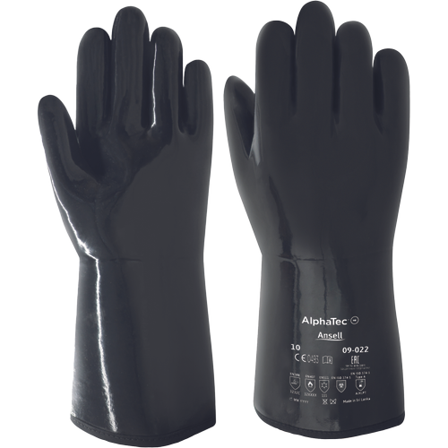 Rokavice AlphaTec® 09-022, odporne proti vročini in mrazu, imajo posebno izolirano Hi-Lo rokavico s prešito bombažno podlogo za uporabo v vročih in hladnih pogojih, ki omogoča občasno rokovanje z vročimi tekočinami do 180˚C in hladnimi temperaturami do -25 C. Poleg tega imajo rokavice AlphaTec® 09-022 odlično širok spekter kemične odpornosti, saj ščitijo pred olji, kislinami, jedkimi snovmi, alkoholi in topili, njihova bombažna podloga pa povečuje oprijem in odpornost na vbod.