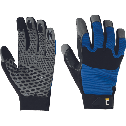 – šivane rokavice iz sintetičnega usnja, spandeksa, najlona, neoprena in poliestra – protizdrsna PVC ojačitev med kazalcem in palcem – odličen oprijem zaradi silikonske obloge dlani in prstov – elastična manšeta na velcro – primerne za zaslone na dotik