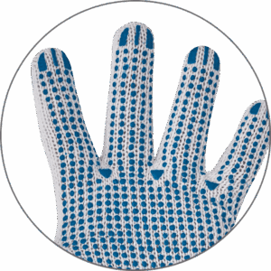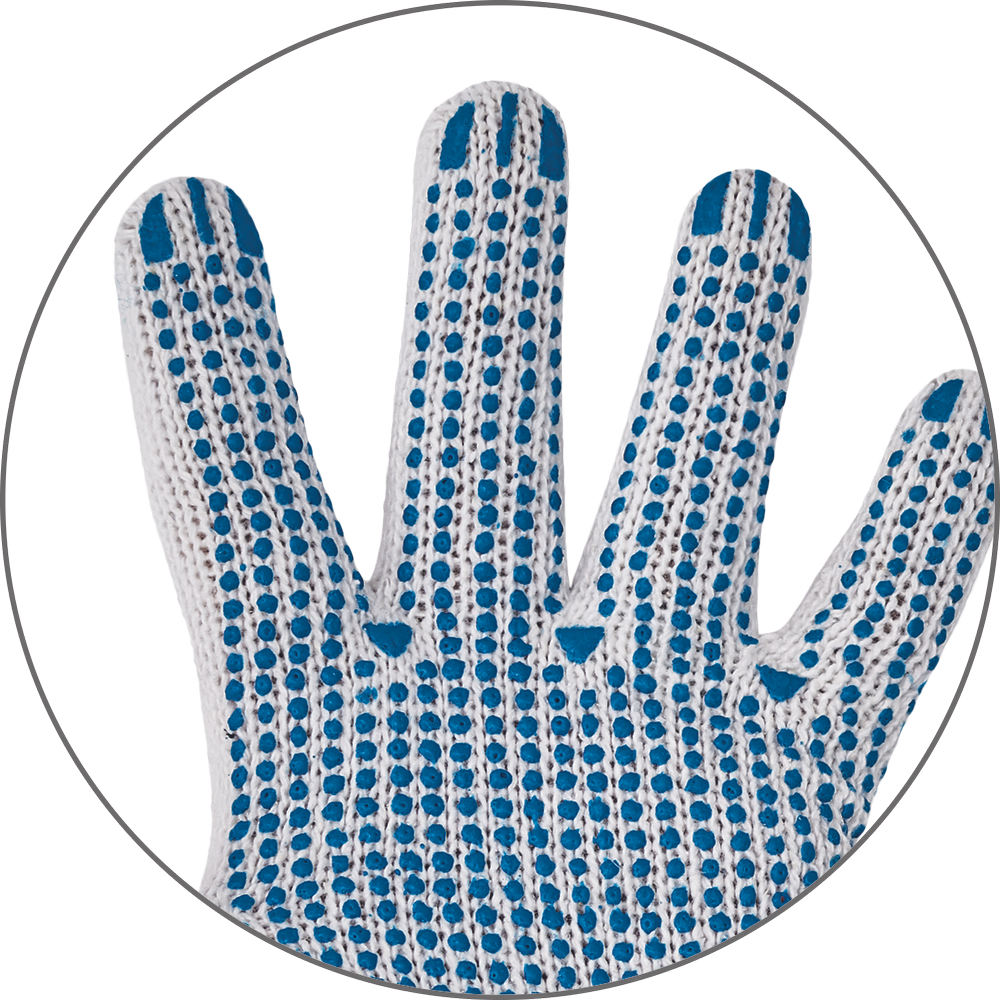 – pletene brezšivne rokavice iz mešanice poliestra in bombaža – PVC pike na dlani in prstih