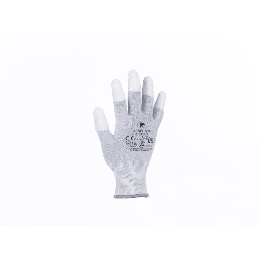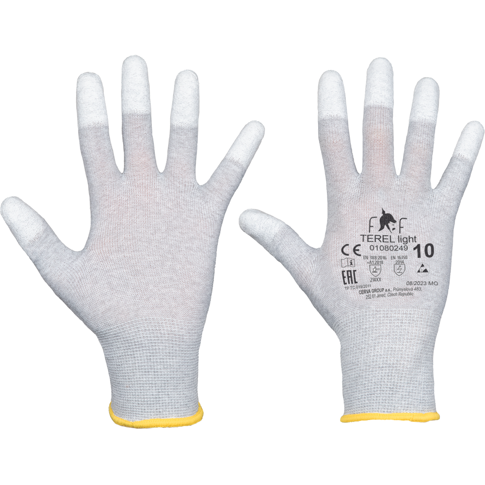 – brezšivne antistatične rokavice iz poliestra – integrirana ogljikova vlakna, namočena v poliuretan na konici prsta – elastična manšeta iz pletenine
