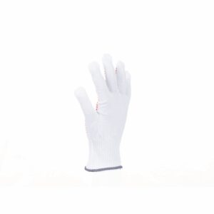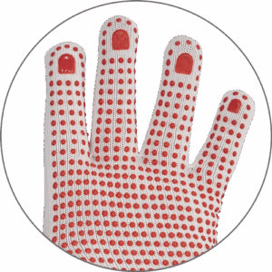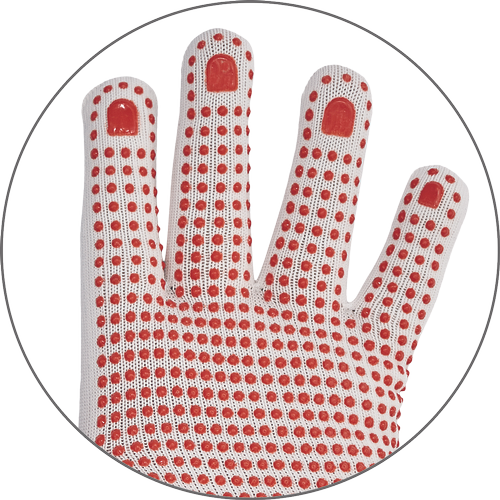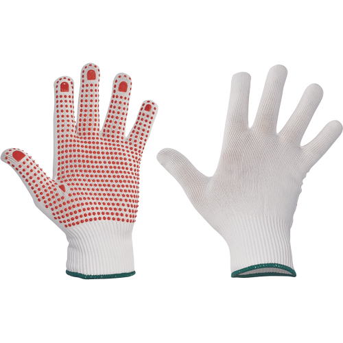 – pletene brezšivne rokavice iz najlona – PVC pike na dlani in prstih – elastično pleteno zapestje