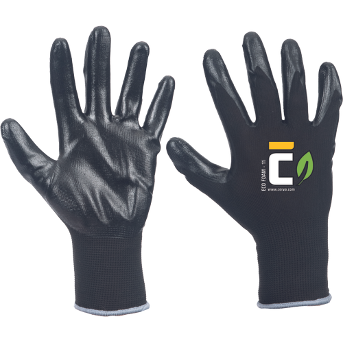 Petprstne brezšivne rokavice so izdelane iz črne reciklirane poliestrske preje za udobno prileganje. Dlan je prevlečena s penastim nitrilom, ki zagotavlja odličen oprijem in prožnost ter je idealna za natančno rokovanje v mokrih in oljnatih industrijskih okoljih. Zanesljiva, ekološko ozaveščena rešitev za zahtevne delovne razmere.