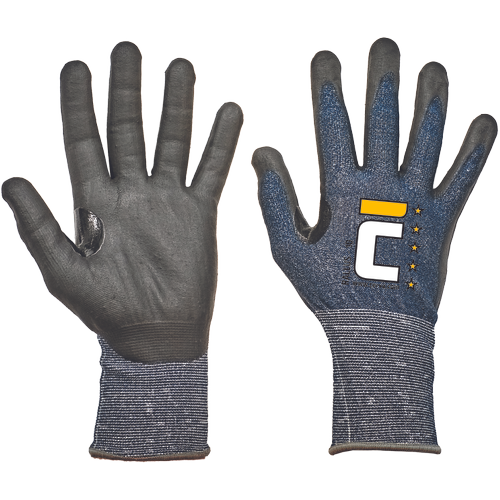 – pletene brezšivne rokavice – stopnja C proti porezovanju – prepojene z nitrilom in okolju prijaznim PU na vodni osnovi, s posebno ojačitvijo na najbolj izpostavljenem delu med palcem in kazalcem – 18 Gauge zagotavlja popolno ergonomijo – elastična manšeta