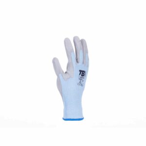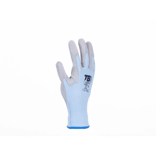 – rokavica z modro brezšivno podlogo iz Tuffalena® in steklenih vlaken, na dlani prepojena s sivim PU – primerna za zaslone na dotik – pletena manšeta – 18 GG