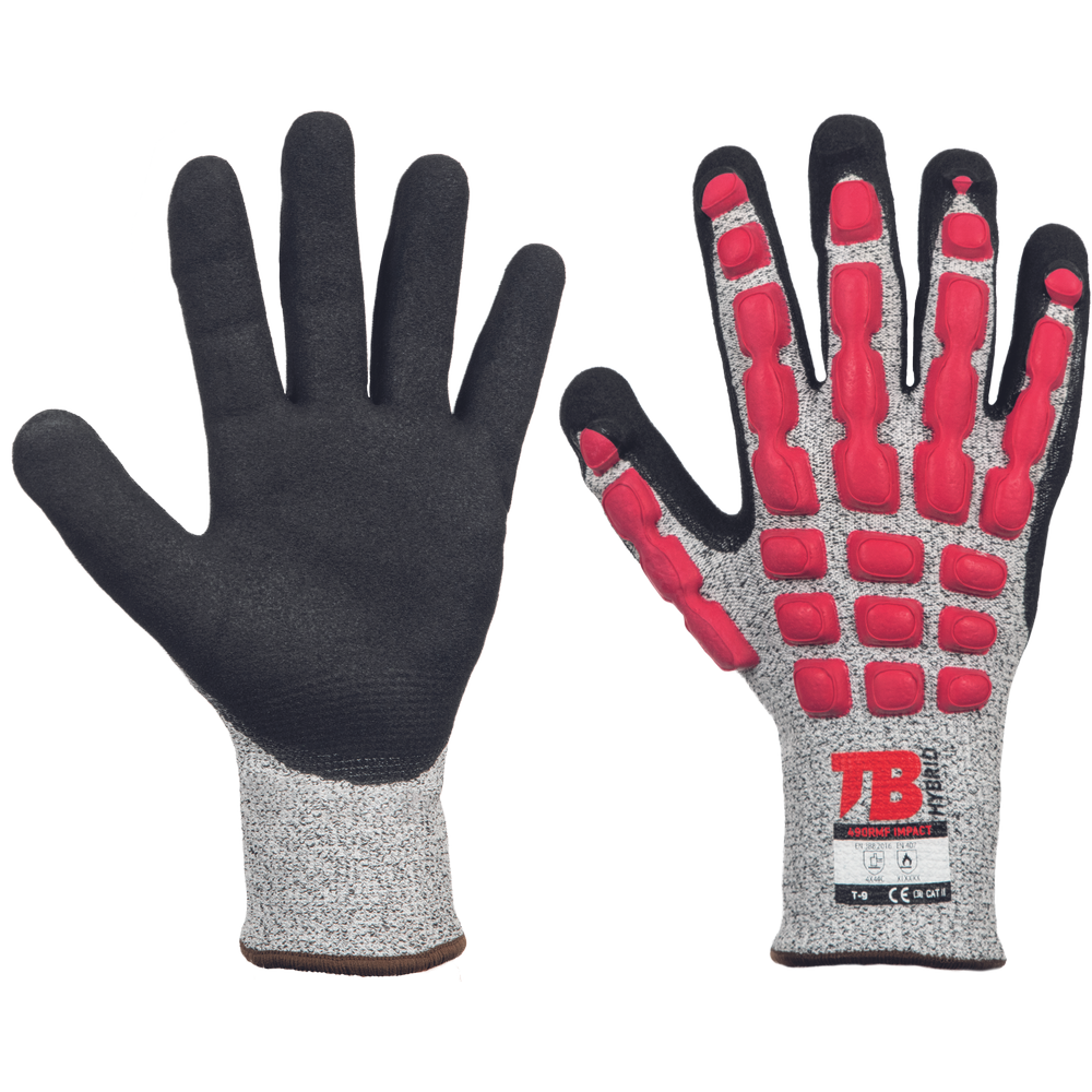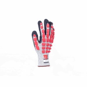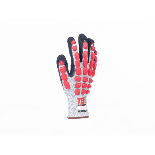 – siva brezšivna podloga iz HPPE z rdečo zaščito iz lateksa proti udarcem na hrbtni strani – črna nitrilna prevleka z mikrofinišem na dlani – 13 GG