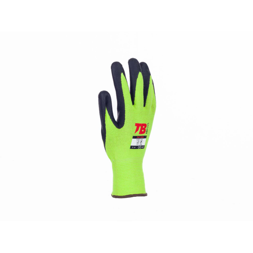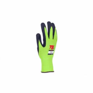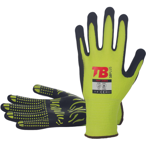 – Visoko vidno rumene brezšivne rokavice iz elastana in bombaža, potopljene v penasto nitrilno prevleko na dlani in s PVC oprijemom z vzorcem zebre na dlani – manšeta iz pletenine – 13 GG