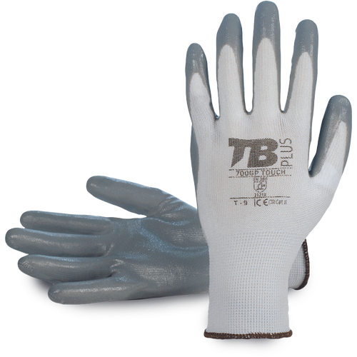 – rokavica z belo brezšivno poliestrsko podlogo – siva nitrilna prevleka na dlani – pleteno zapestje – premer 13