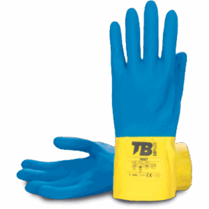 – modro-rumena dvobarvna rokavica iz naravnega lateksa – podloga s potiskom – ravna manšeta – debelina: 0,60 mm – skupna dolžina: 30 cm
