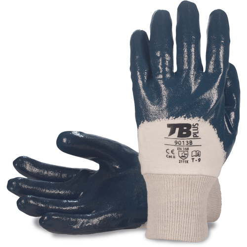 – rokavice z bombažno podlogo, 3/4 modre nitrilne omake, pletena manšeta – dobra odpornost na olja, maziva in oljne stranske proizvode – elastična manšeta in lahka podlaga rokavic, ki vpija vlago