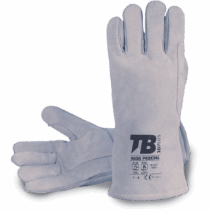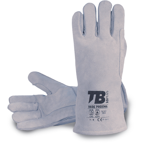 – rokavica iz sivega cepljenega govejega usnja – negorljiva podloga – ojačitev na dlani in palcu – sešita s para-aramidno nitjo – debelina: 1,3 mm – skupna dolžina: 34 cm – tip A: priporočljivo za spajkanje MIG