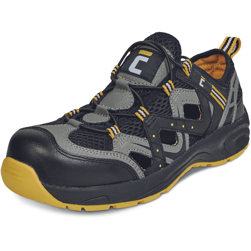 Izjemno lahek in udoben poklicni sandal, primeren za preprosto delo v zaprtih prostorih ali na prostem v poletni sezoni. Zgornji del je izdelan iz pravega usnja in zračne mrežice, ki zagotavlja ustrezno kroženje zraka. Podplat je izdelan iz kombinacije filona in gume, kar zagotavlja ne le odlične protizdrsne lastnosti, temveč tudi visoko odpornost proti obrabi. Elastične vezalke omogočajo, da se čevlji popolnoma prilagodijo obliki stopala. Rumeni dodatki povečujejo vidnost uporabnika