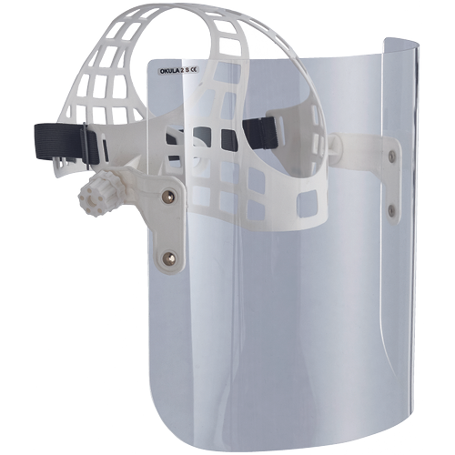 tip ščita z nosilcem za glavo. Zasnovan je za zaščito oči in obraza pred udarci počasi letečih delcev z udarno energijo do 0,56 J. Hkrati ščit varuje dihalne poti pred neposrednim vdihavanjem mehanskih delcev. Primeren je za vse vrste mehanske obdelave, zlasti lesa in plastike, ” za montažna dela v elektroindustriji, za delo v zdravstvu (zobozdravstvo, laboratorij). Ne ščiti pred tekočimi razpršili! Omogoča hkratno uporabo korekcijskih očal. Barva naglavnega traku z nosilci: bela, črna. Možnost dobave nadomestnega vizirja in naglavnega traku z nosilci.