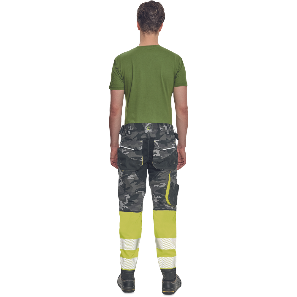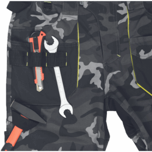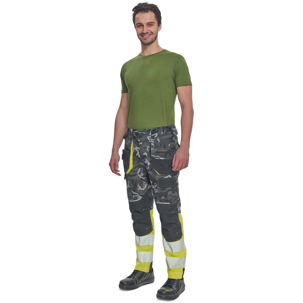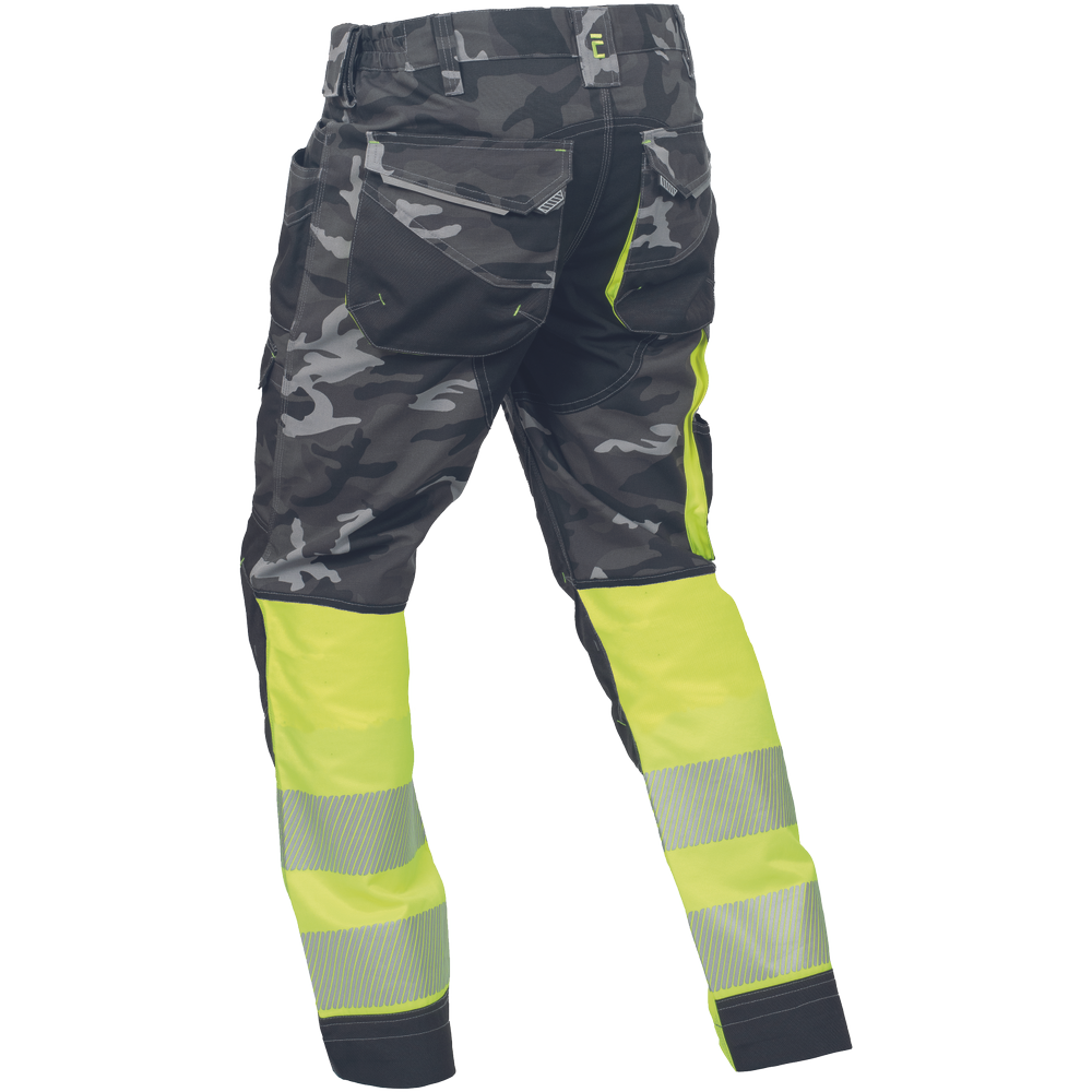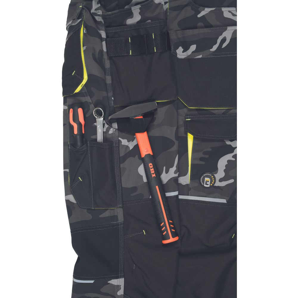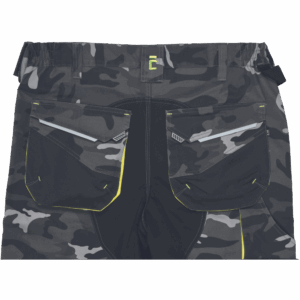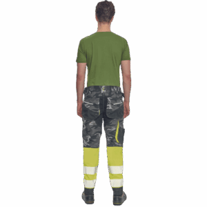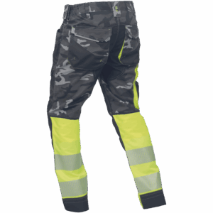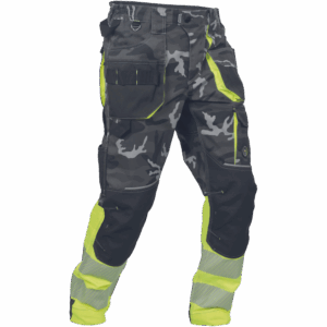 – moške delovne hlače HI-VIS z elastičnim pasom in večnamenskimi žepi – ojačitev kolenskih žepov Oxford 600D za vstavljanje kolenskih blazinic – trpežni trojni šivi na nogah in mednožju – odsevne cevi, spodnji del noge s 7 cm odsevnimi potiskanimi in segmentnimi črtami – sodoben maskirni tisk – podaljšana dolžina nog