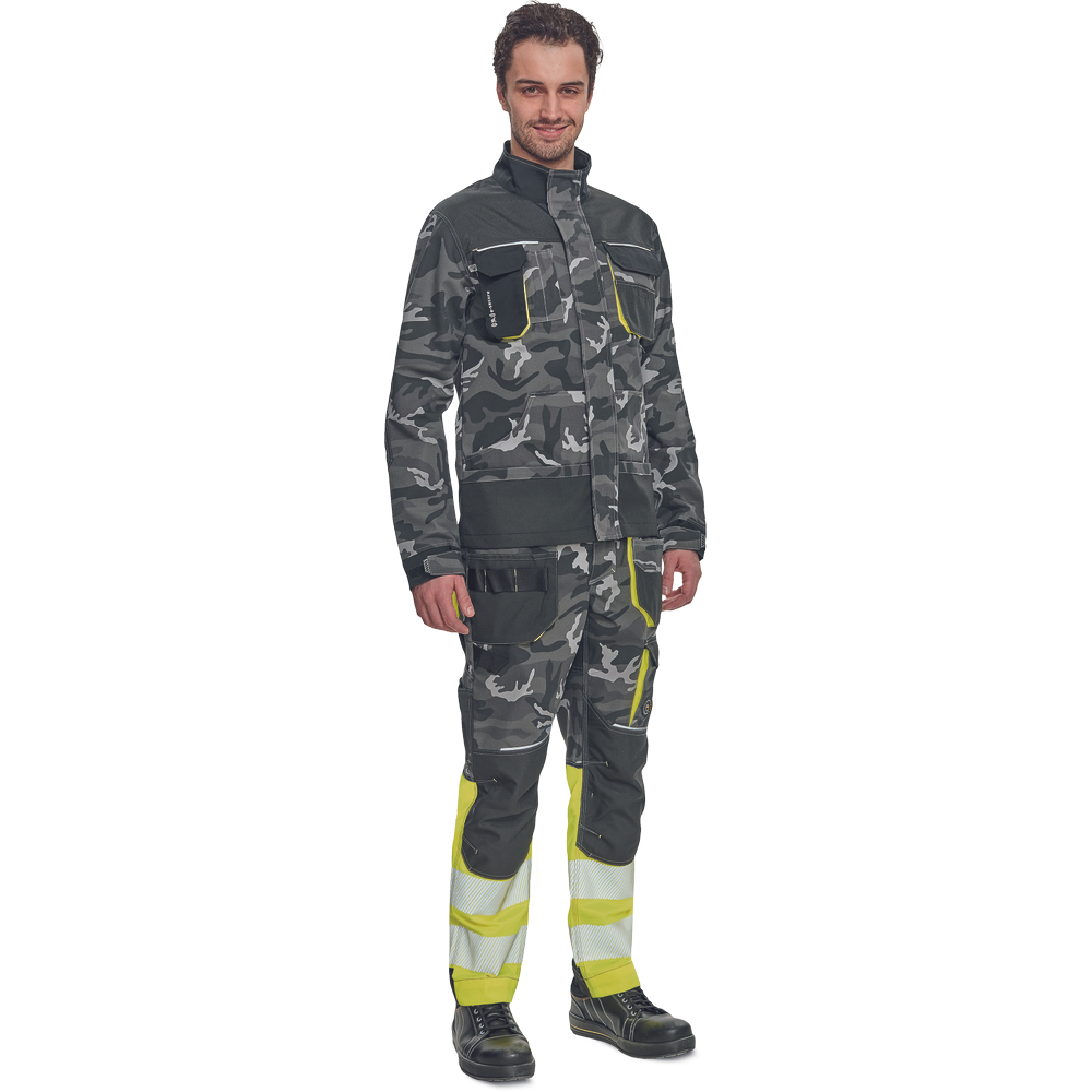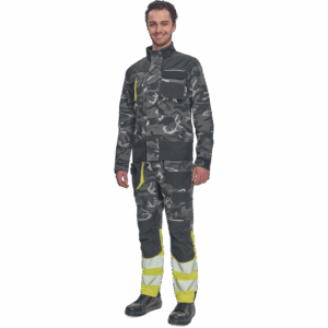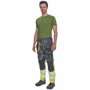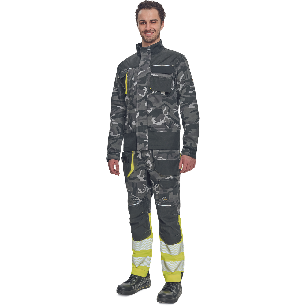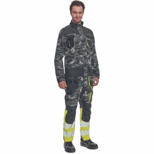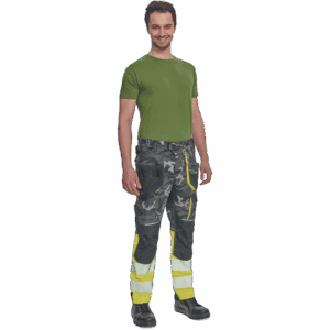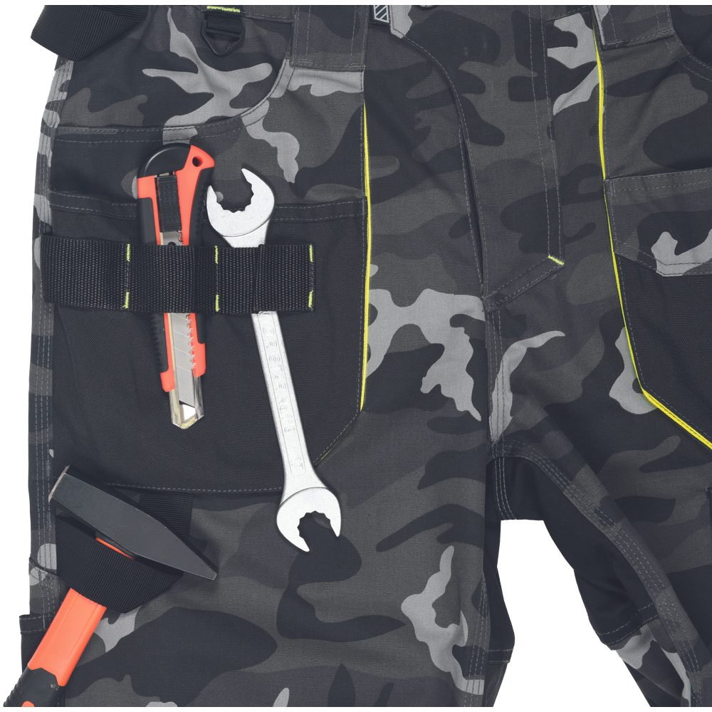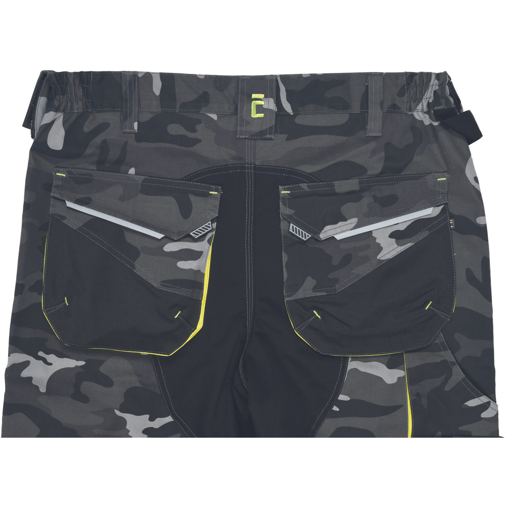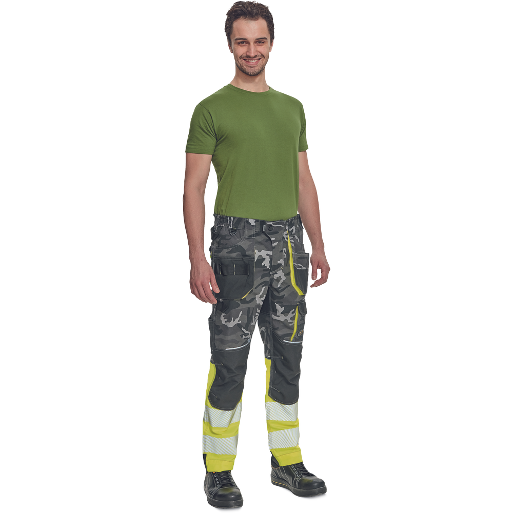 – moške delovne hlače HI-VIS z elastičnim pasom in večnamenskimi žepi – ojačitev kolenskih žepov Oxford 600D za vstavljanje kolenskih blazinic – trpežni trojni šivi na nogah in mednožju – odsevne cevi, spodnji del noge s 7 cm odsevnimi potiskanimi in segmentnimi črtami – sodoben maskirni tisk – podaljšana dolžina nog