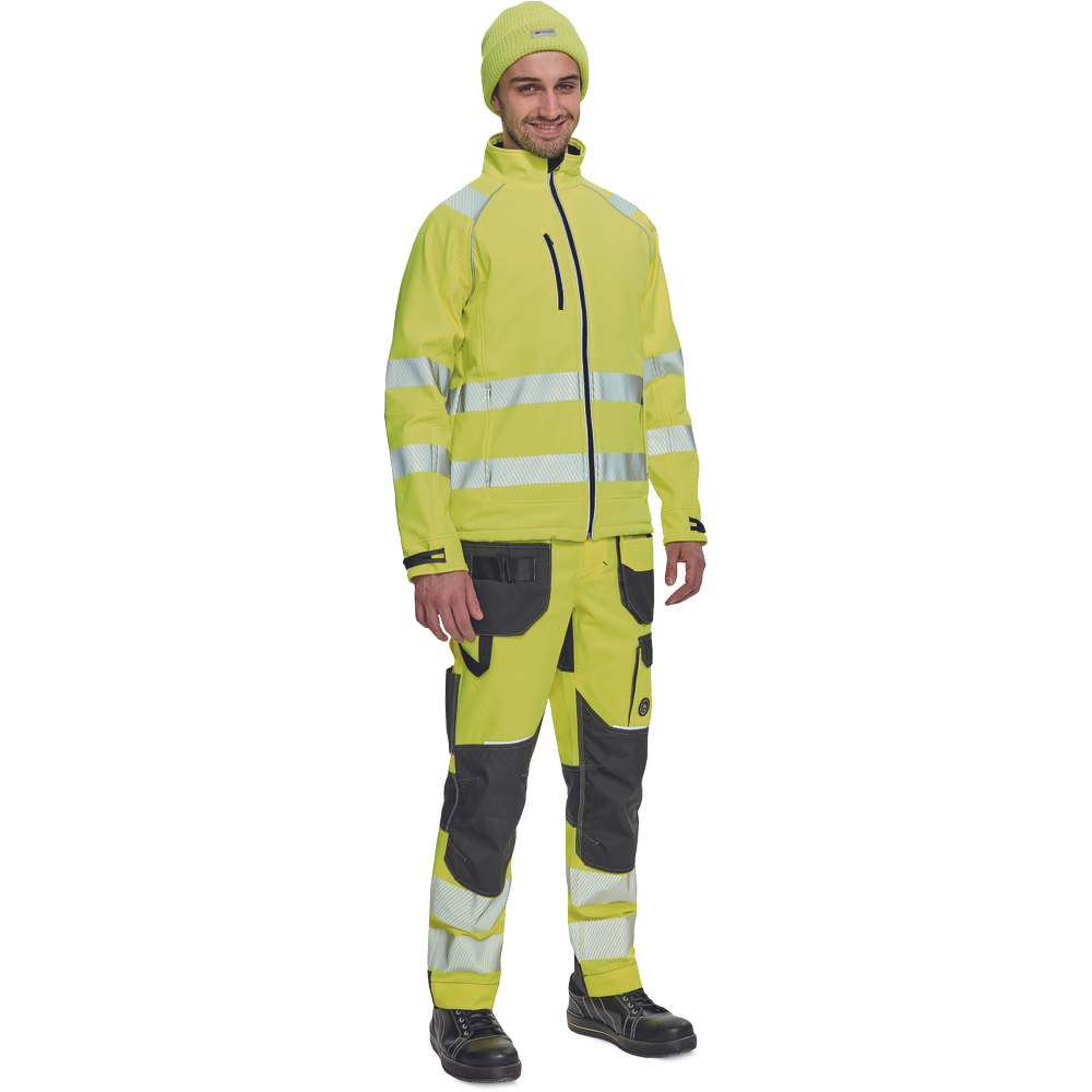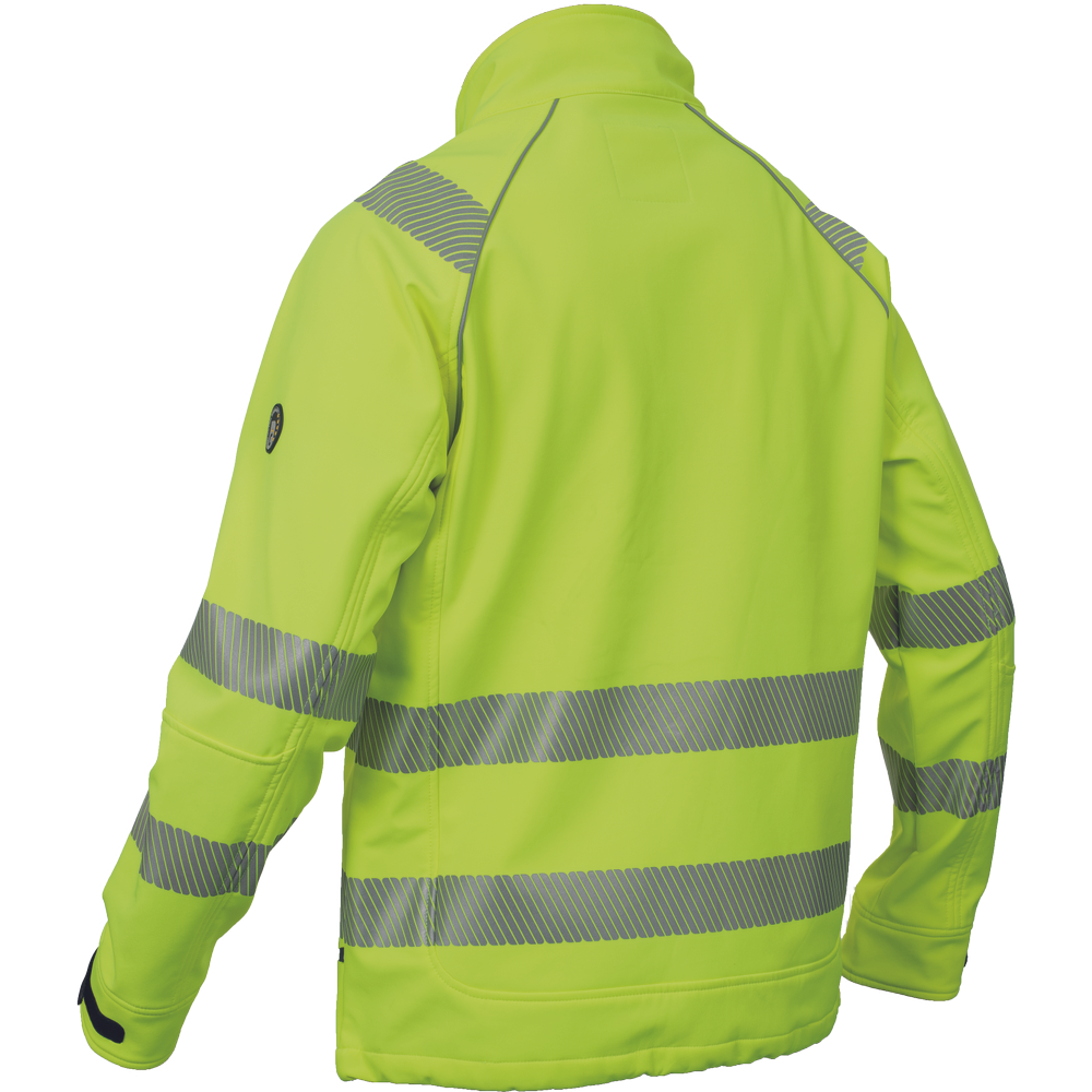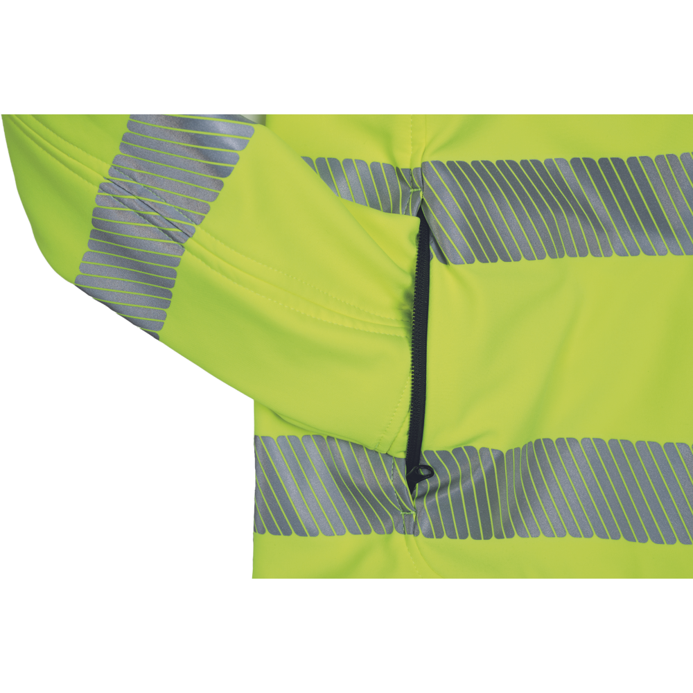 – moška softshell jakna HI-VIS z membrano in notranjo plastjo flisa – 2 stranska žepa na zadrgo, 1 prsni žep na zadrgo – 3 večnamenski notranji žepi – 2 odsevna segmentna potiskana trakova širine 5 cm okoli bokov, rokavov in čez ramena – nastavljivi robovi rokavov z velcro – okrasne cevi in šivi v kontrastni barvi