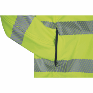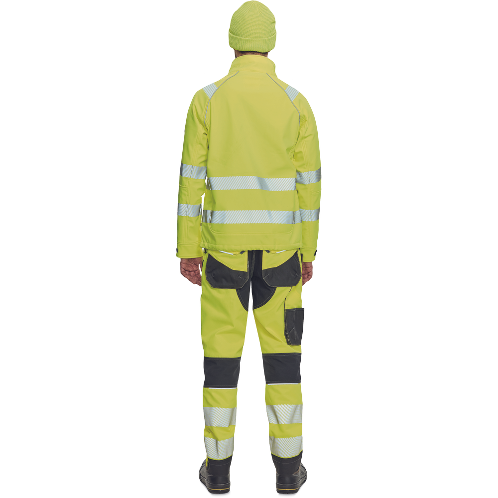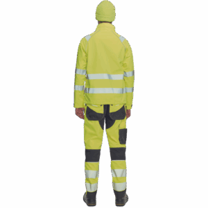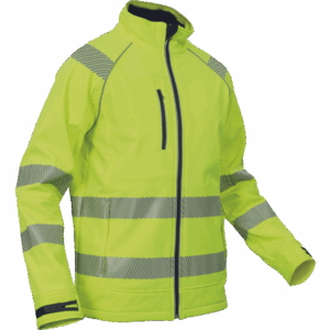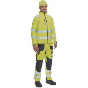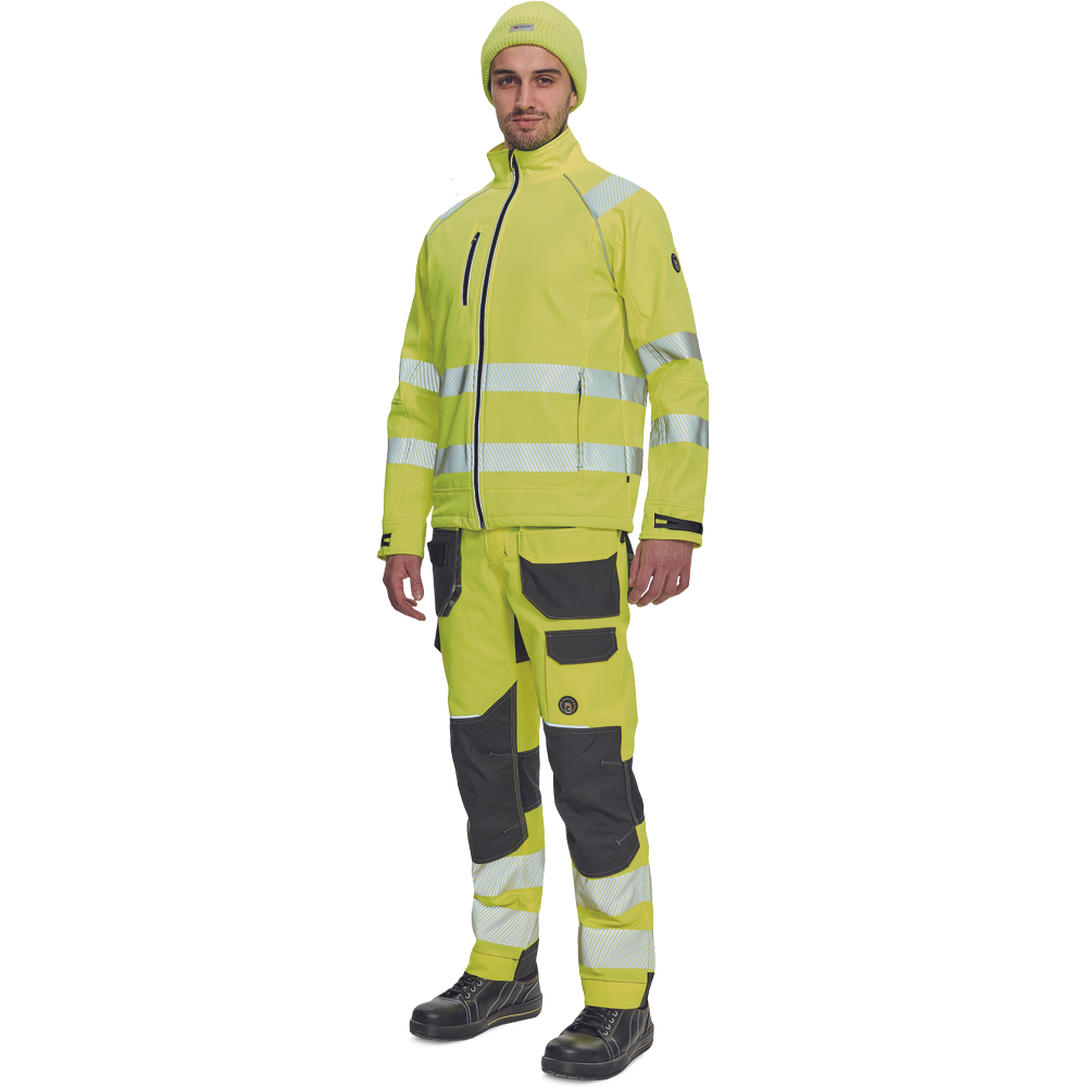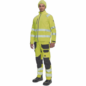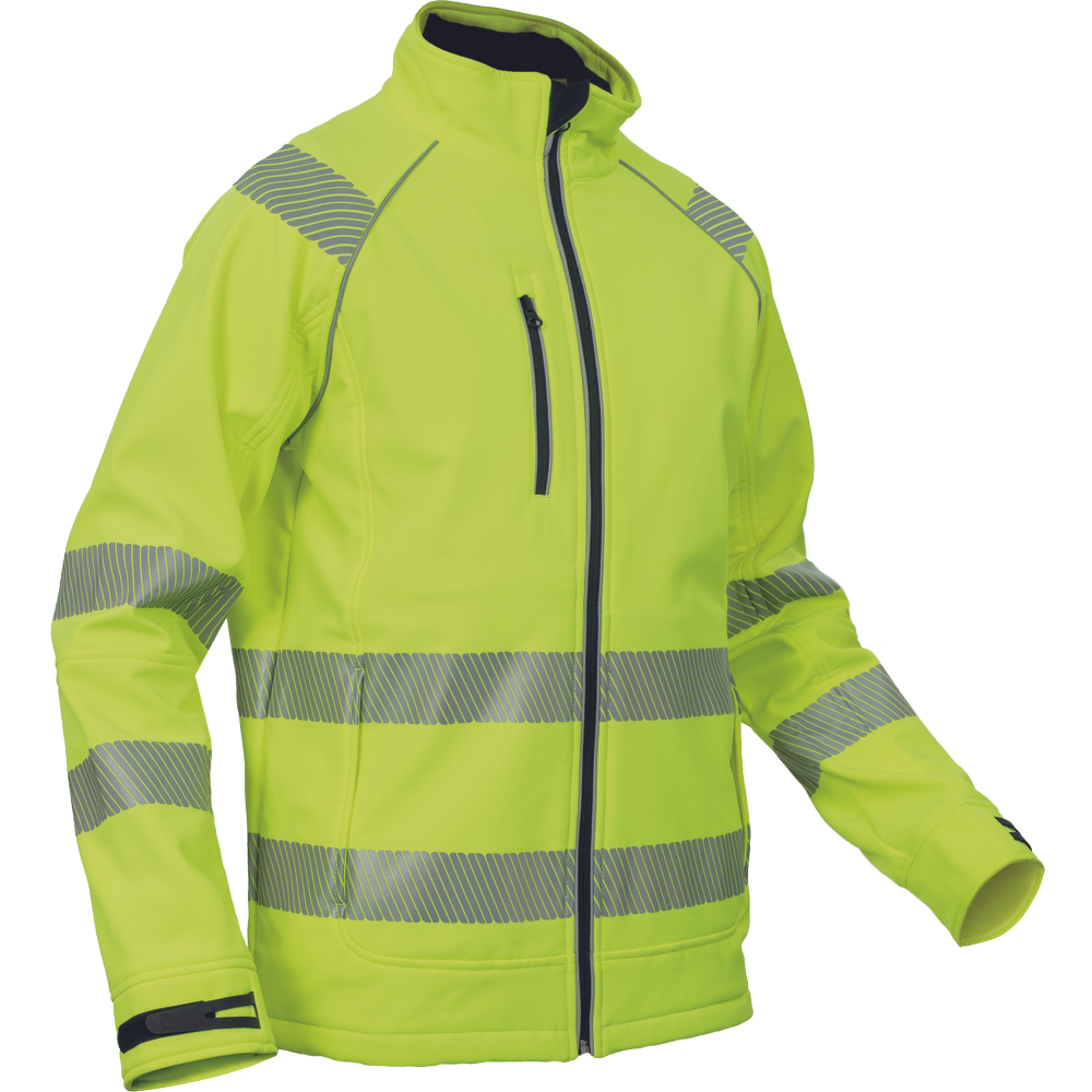 – moška softshell jakna HI-VIS z membrano in notranjo plastjo flisa – 2 stranska žepa na zadrgo, 1 prsni žep na zadrgo – 3 večnamenski notranji žepi – 2 odsevna segmentna potiskana trakova širine 5 cm okoli bokov, rokavov in čez ramena – nastavljivi robovi rokavov z velcro – okrasne cevi in šivi v kontrastni barvi