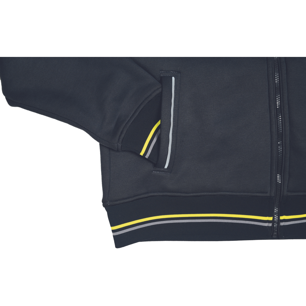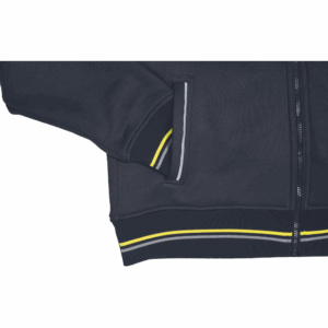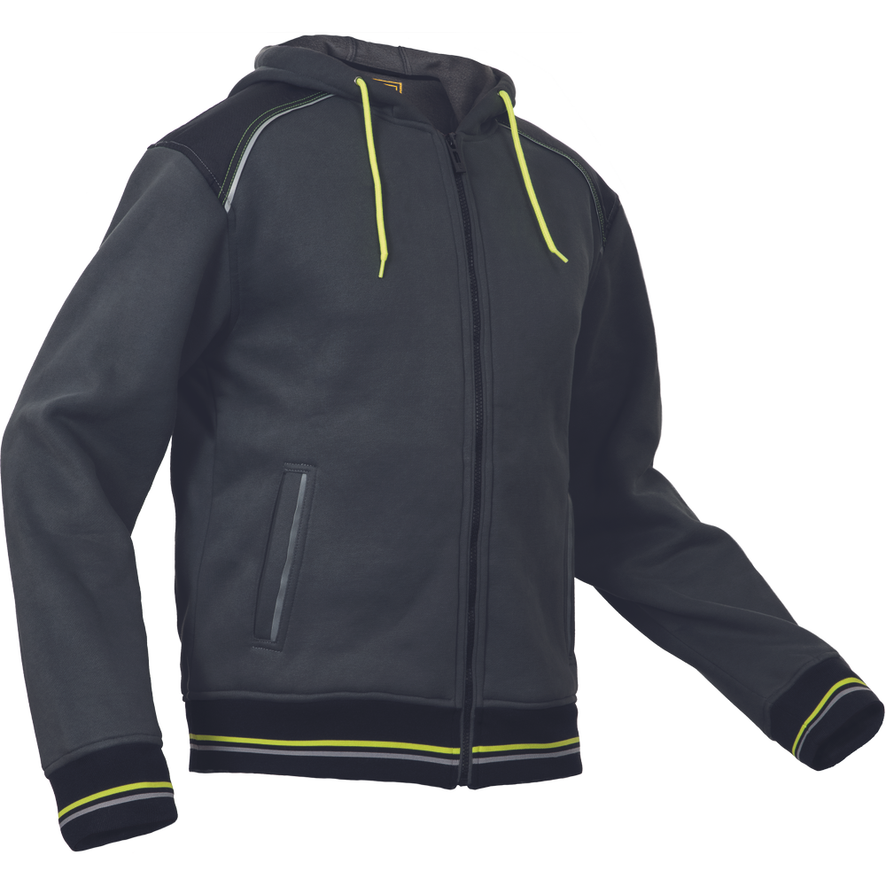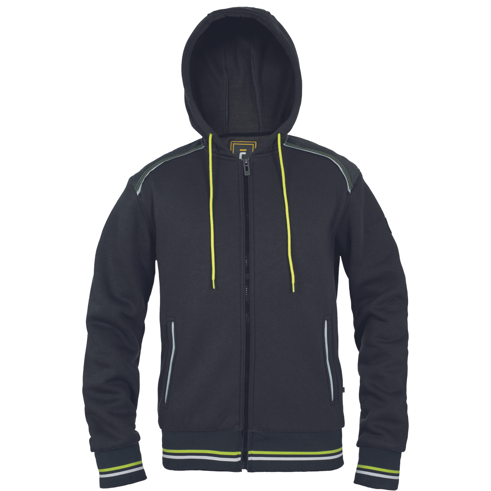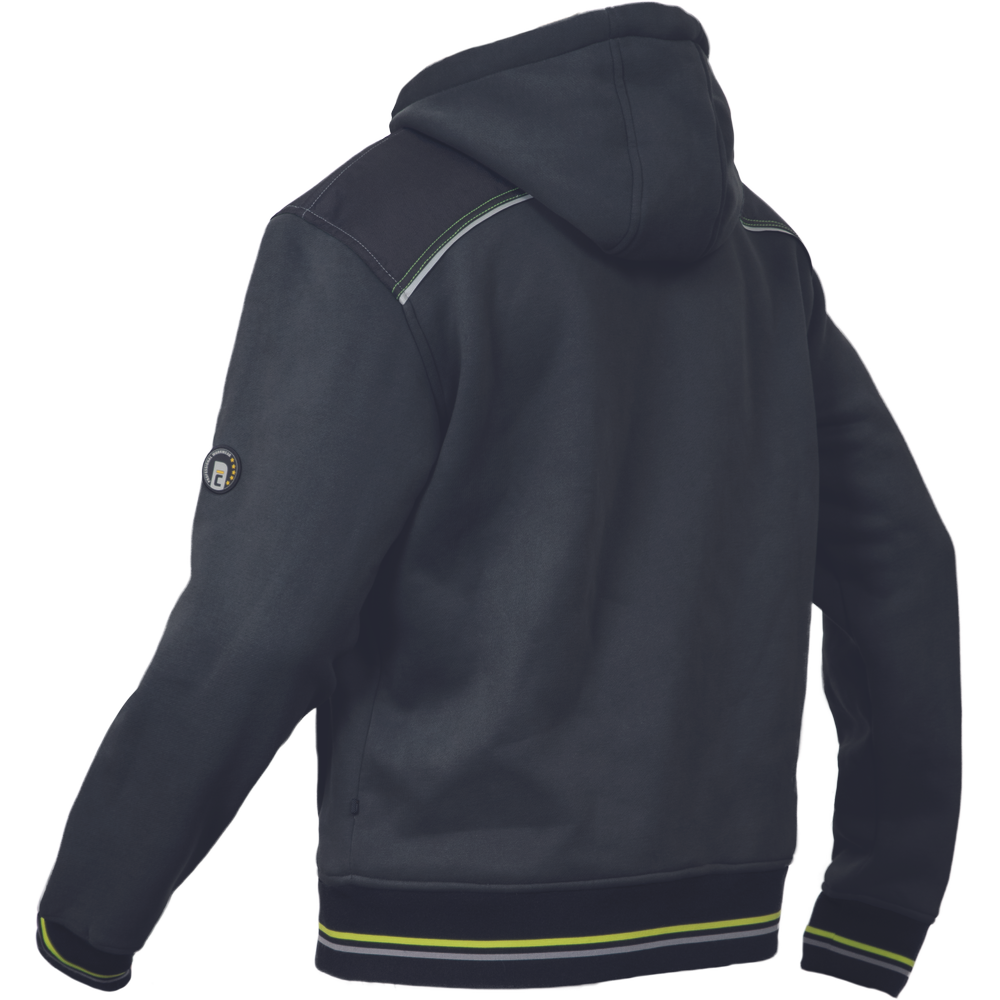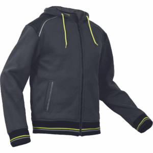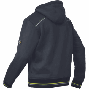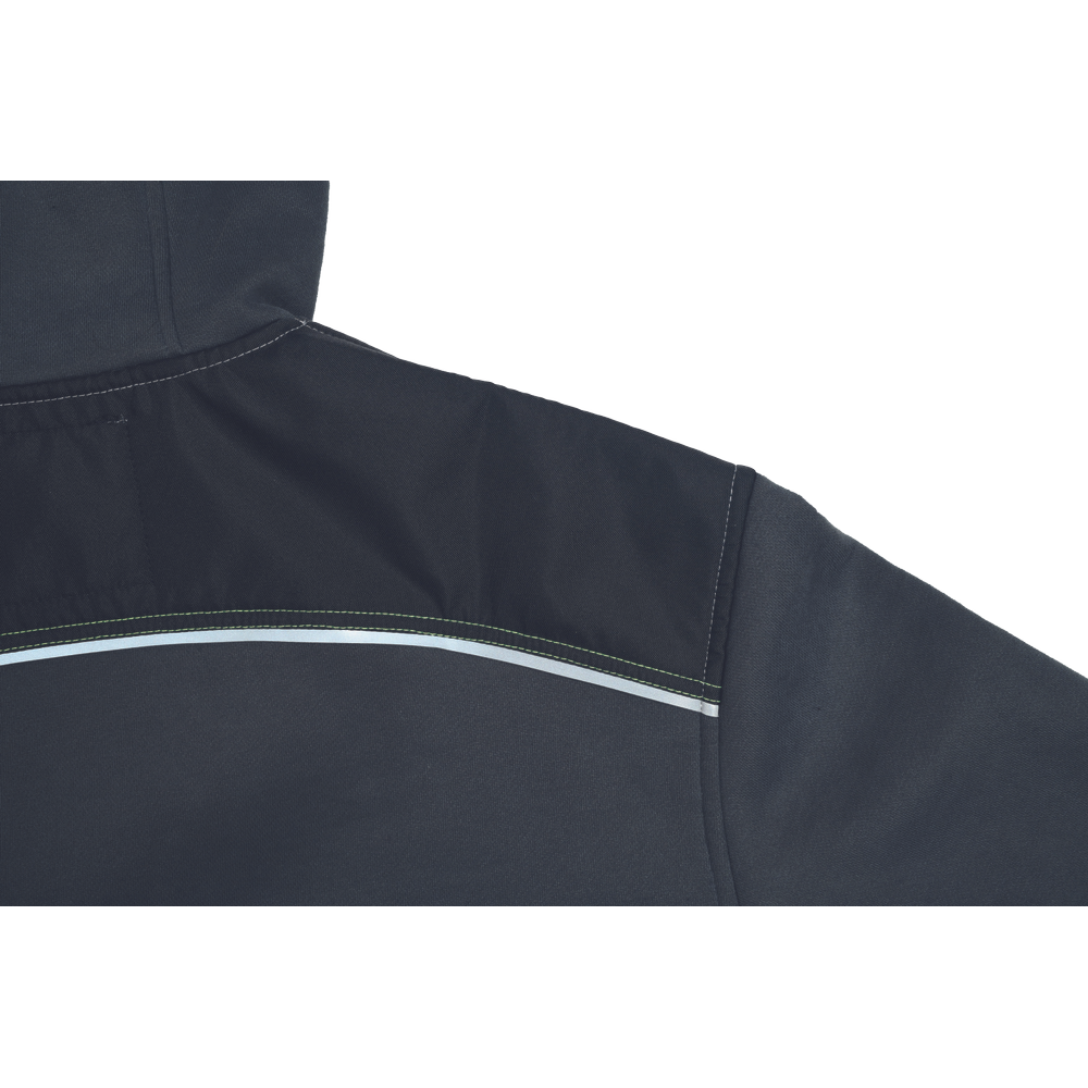 – kapuca z zadrgo iz mešanice poliestra in bombaža – notranjost iz francoskega frotirja, ki ni brušena – sedlo in stranski žepi podloženi z odsevnimi cevmi – dvoslojna kapuca in okrasni šivi – elastični robovi na rokavih in dnu