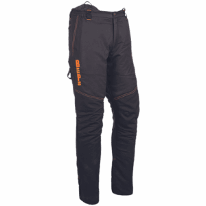 – Moške vodoodporne zaščitne hlače za rezkarje z motorno žago – vnaprej oblikovana ojačitev proti umazaniji – sprednja zadrga – 2 vstavljena žepa, 1 našit žep z zadrgo na zadnji strani – 1 našit žep za merilno opremo in pritrditev ključa za vžigalne svečke – elastičen pas z zanko za pas in zankami za naramnice na velcro – zadaj naramnice z zanko za naramnice – trojni šiv na zadnjem šivu do notranje strani noge – certificirano kot zaščitno oblačilo za uporabnike ročnih motornih žag razreda 1 – hitrost verige 20 m/s.