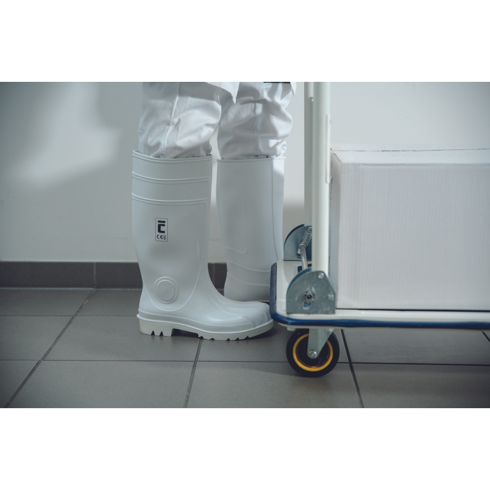 Antistatični, na udarce rastlinskih in živalskih maščob odporni visoki varnostni škornji iz PVC in nitrila z jeklenim prstnim pokrovom in globoko profiliranim podplatom. Prilagodljivi do -20 °C. Standard: EN ISO 20345:2011 S4