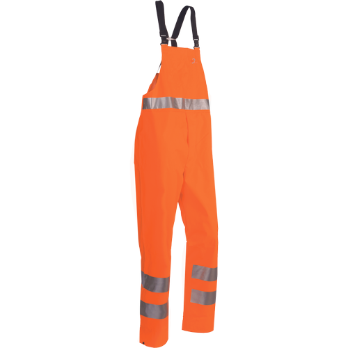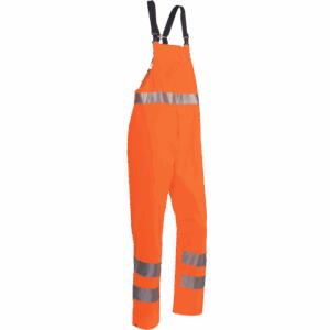 udobne hlače z naprsnikom Hi-Vis, odporne na dež; fluorescentna barva in odsevne črte okoli pasu in na koncih nog; konce nog je mogoče zožiti z gumbi; sprednji del je opremljen z gumbi za pritiskanje