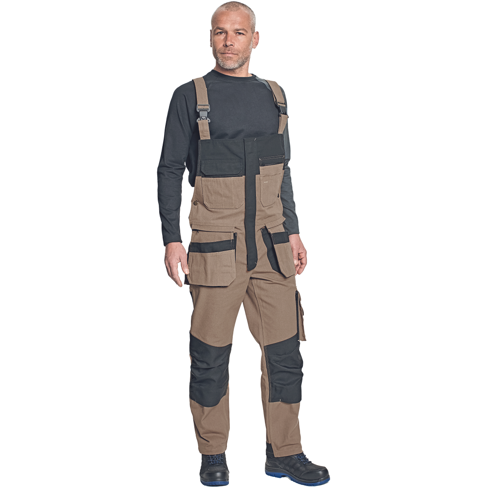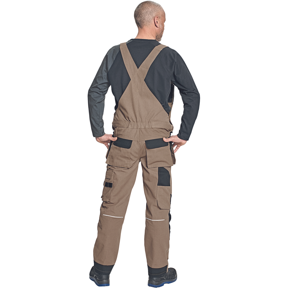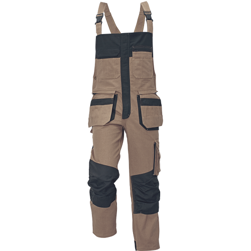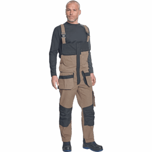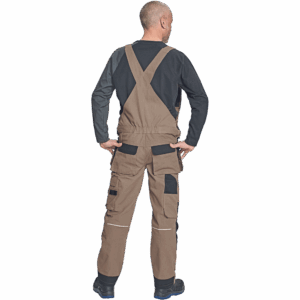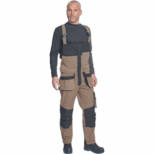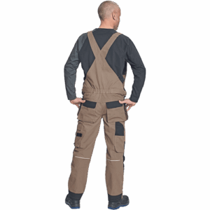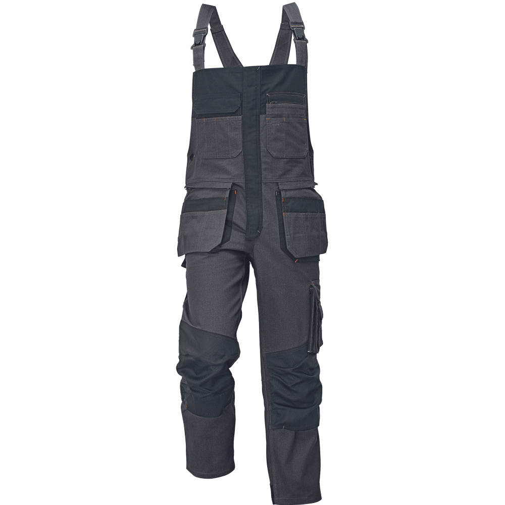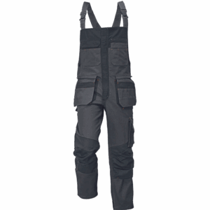 – moške delovne hlače z naprsnikom – snemljivi večnamenski žepi na sprednjem delu z možnostjo vstavitve prostornih sprednjih žepov – 1 večnamenski stranski žep na nogi z zanko za kladivo – 2 žepa za orodje na drugi nogi – 2 velika žepa s poklopcem in zapiranjem na velcro na zadnjem delu – ojačana kolenska žepa iz tkanine Oxford, primerna za vstavitev kolenske blazinice – 2 večnamenska prsna žepa – zapiranje na zadrgo, prekrito z naramnicami z velcro – nastavljiva dolžina naramnic – elastičen pas – jeans gumbi na stranskem delu – trojni šivi in trakovi za ojačitev – nastavljiva dolžina nog – odsevne cevi na zadnjem kolenskem delu