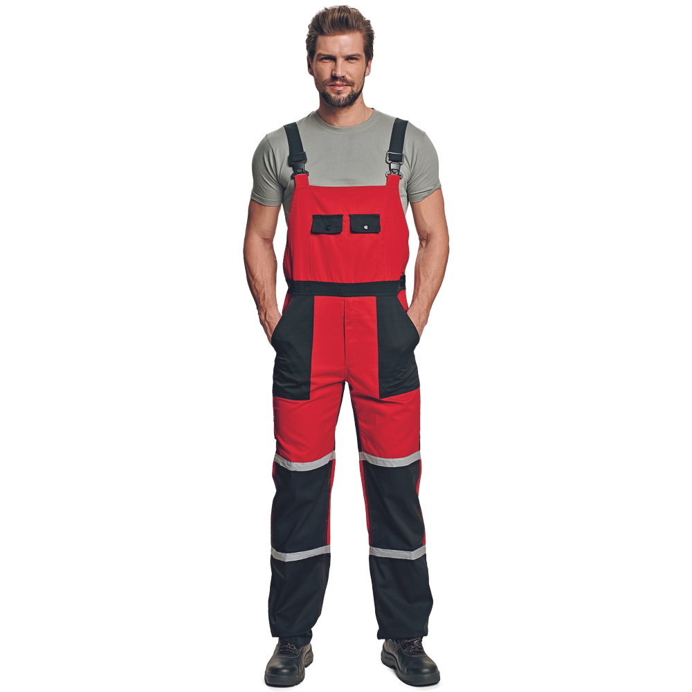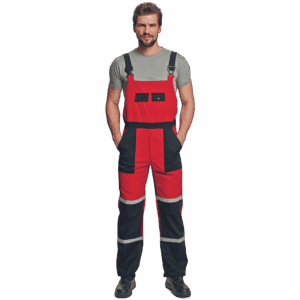 – moške delovne hlače z naprsnikom z elastičnim pasom – impregnacija, odporna na olje in vodo – 6 funkcionalnih žepov – elastične naramnice s plastičnimi zaponkami – odsevne črte