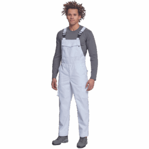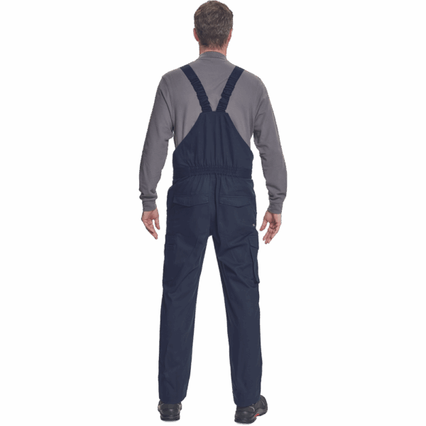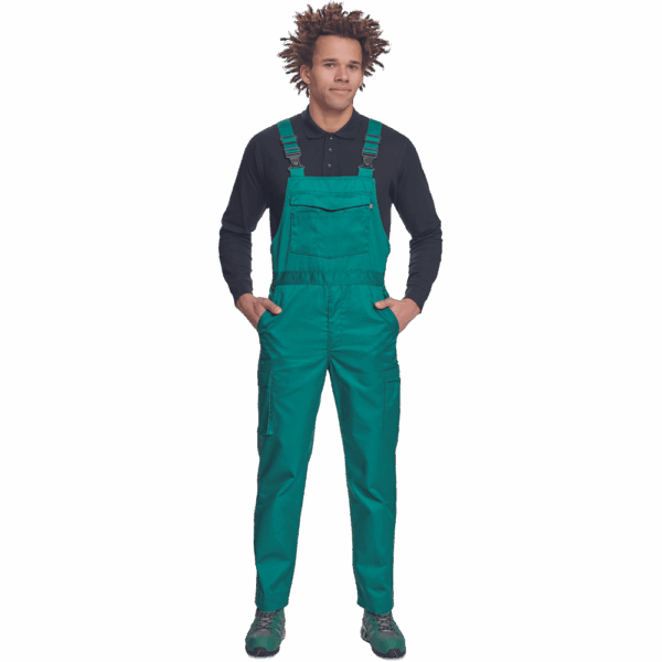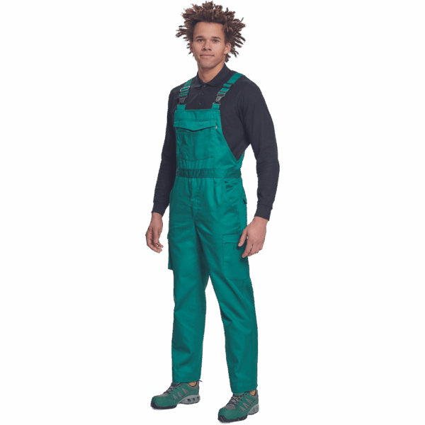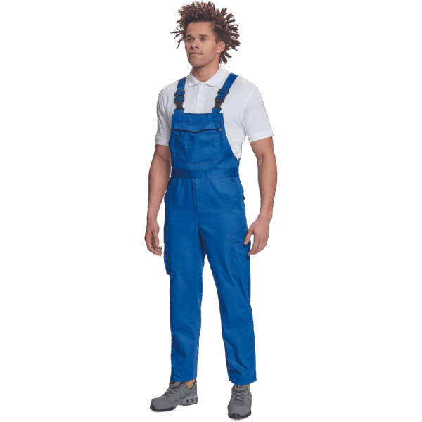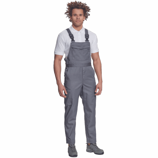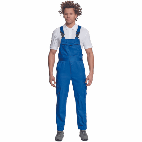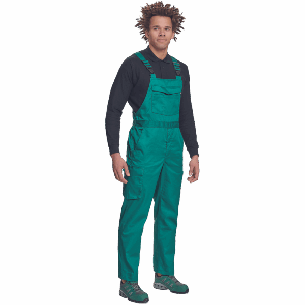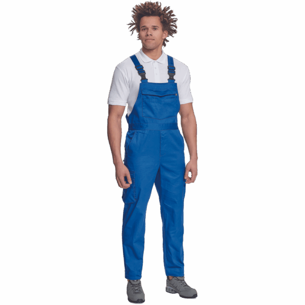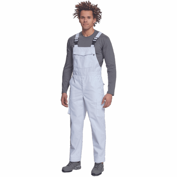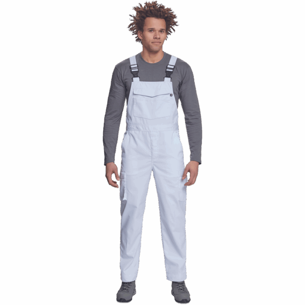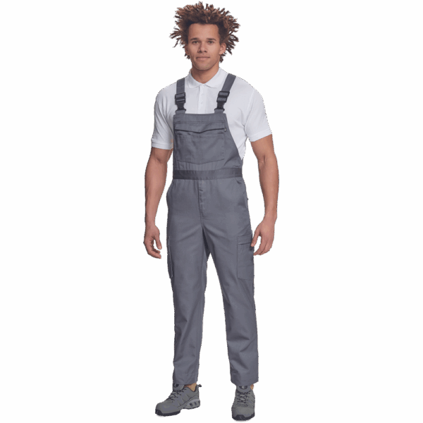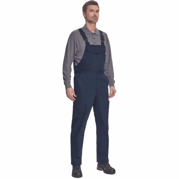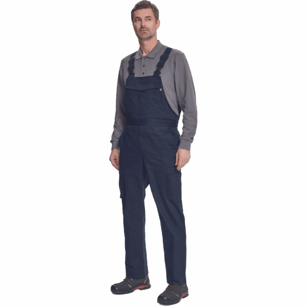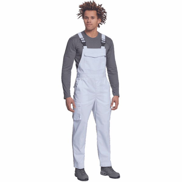 – moške delovne lahke hlače z naprsnikom z elastičnim delom na zadnji strani – 2 stranska žepa, 1 žep za kovance – 2 večnamenska žepa na stegnih, 2 zadnja žepa – 1 velik večnamenski žep za naprsnik – elastični naramnice z zaponko – podaljšljiva dolžina nogavic