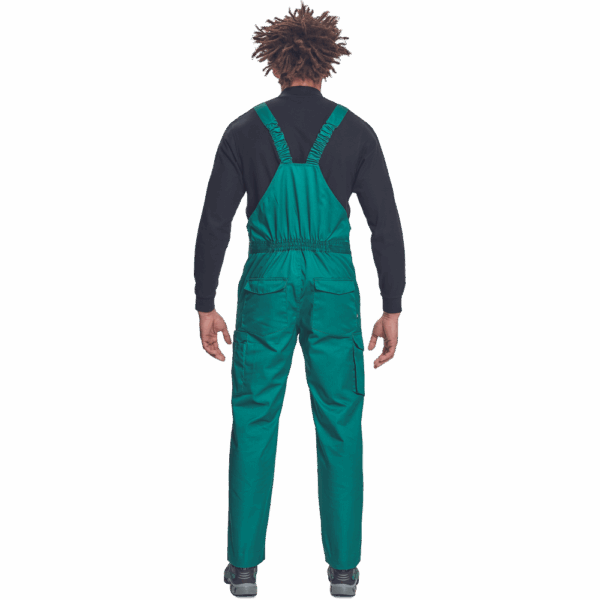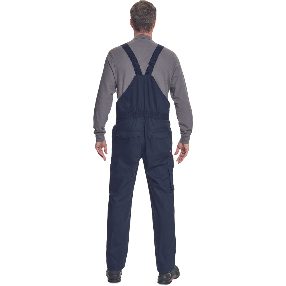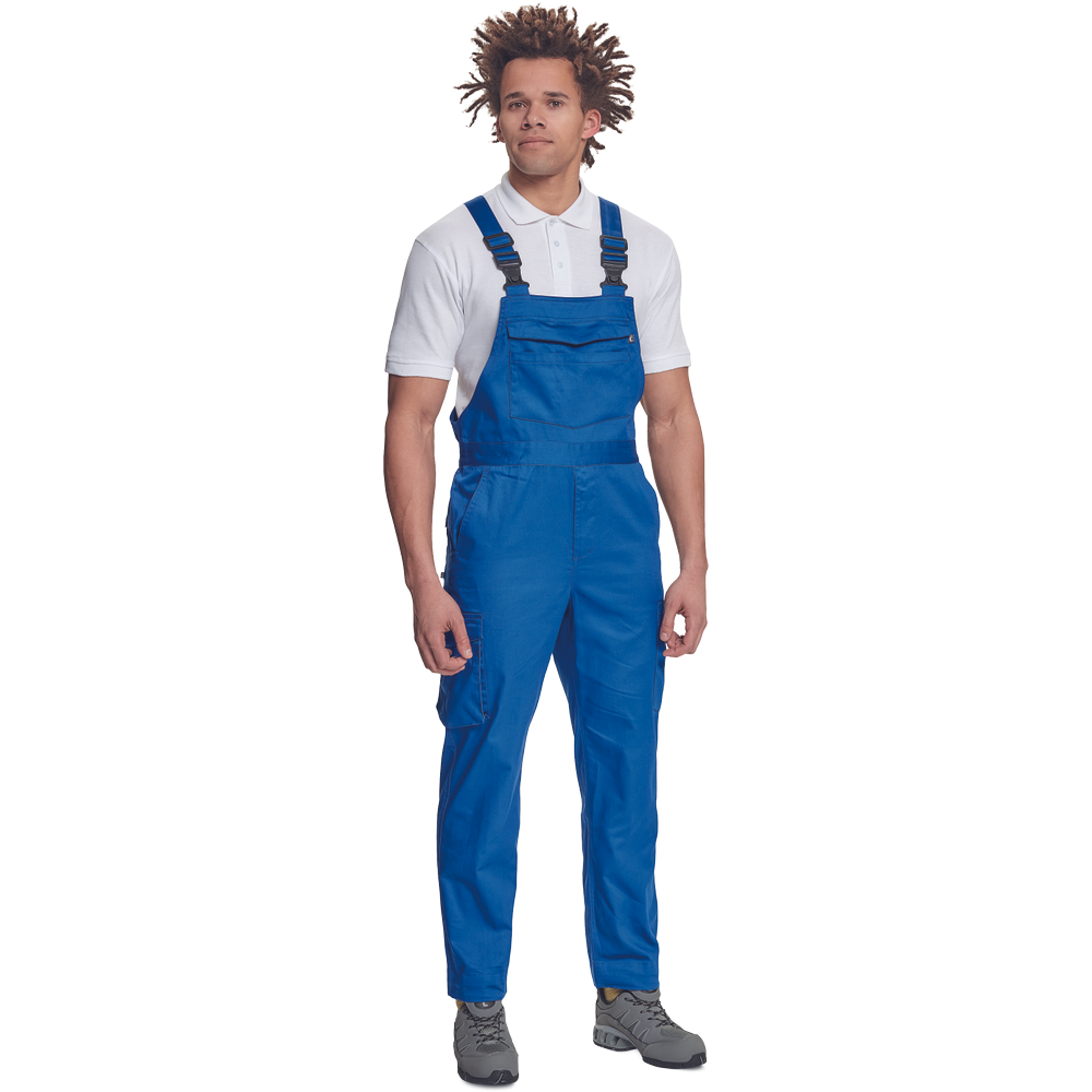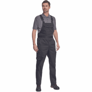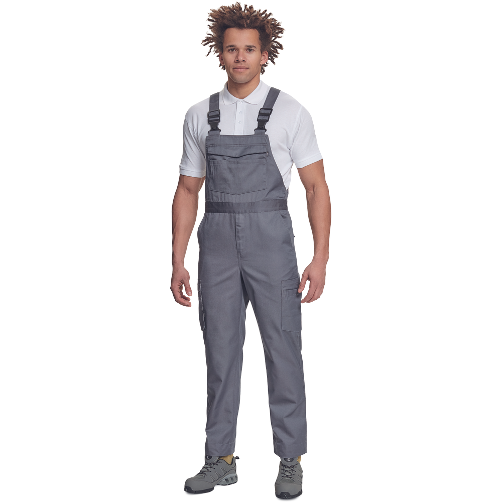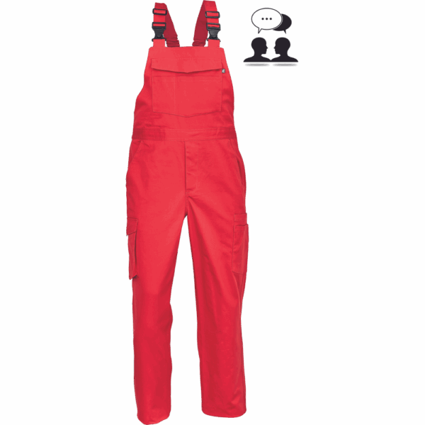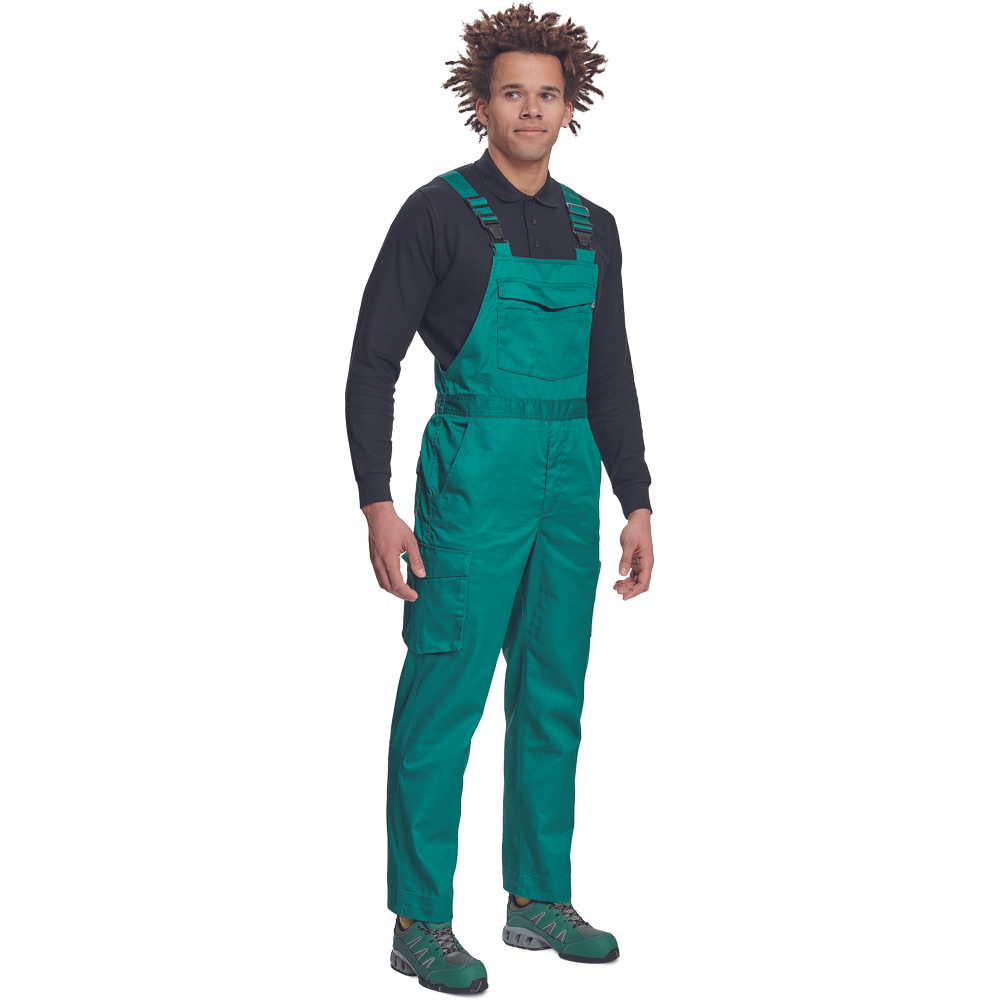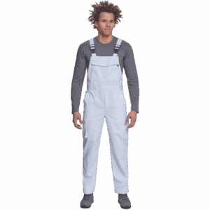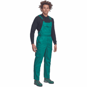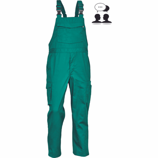 – moške delovne lahke hlače z naprsnikom z elastičnim delom na zadnji strani – 2 stranska žepa, 1 žep za kovance – 2 večnamenska žepa na stegnih, 2 zadnja žepa – 1 velik večnamenski žep za naprsnik – elastični naramnice z zaponko – podaljšljiva dolžina nogavic