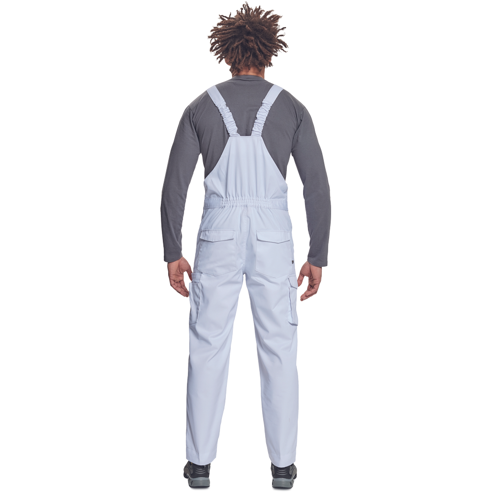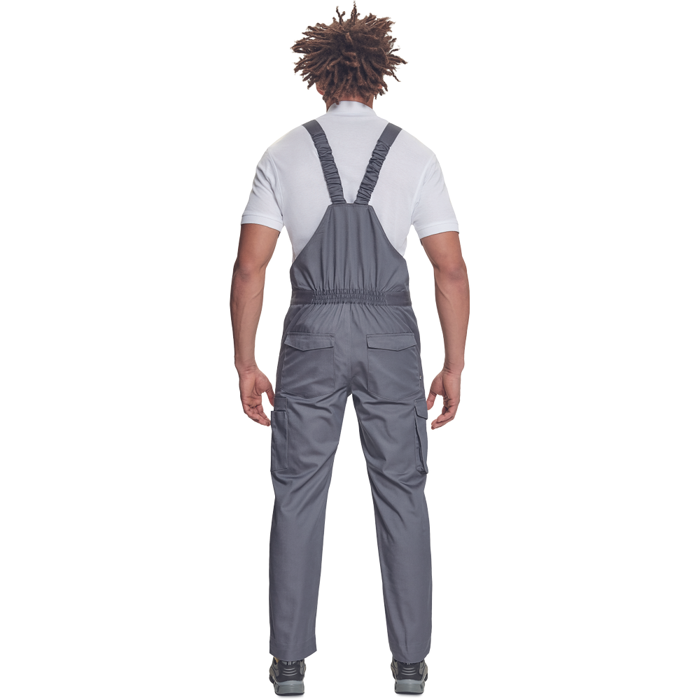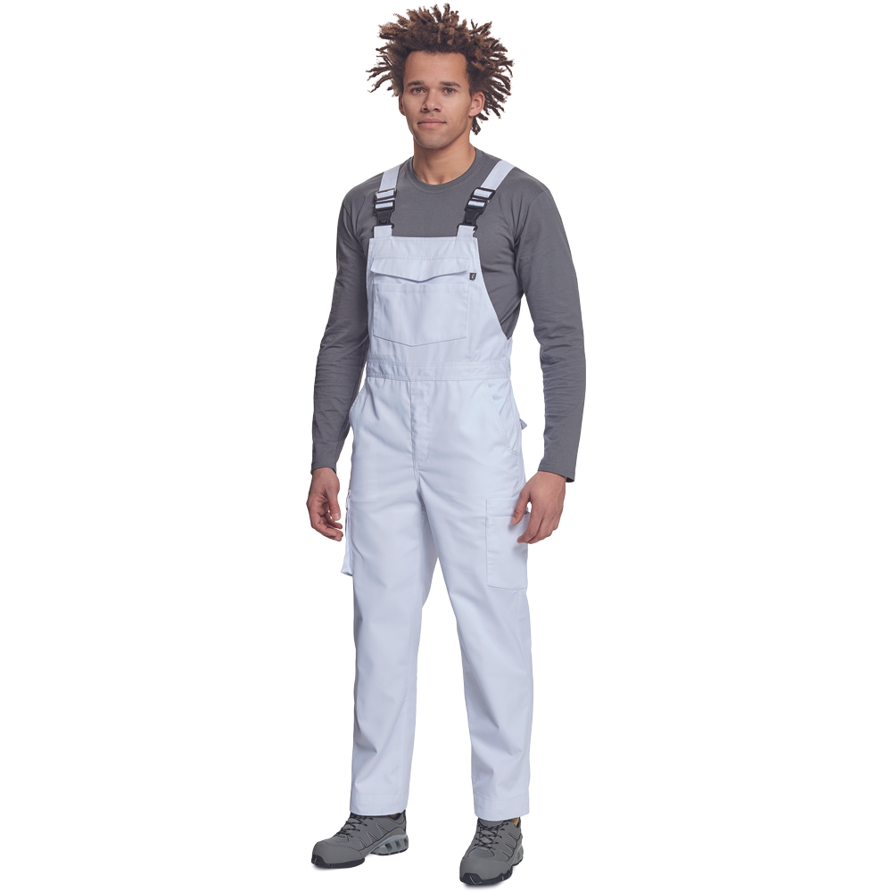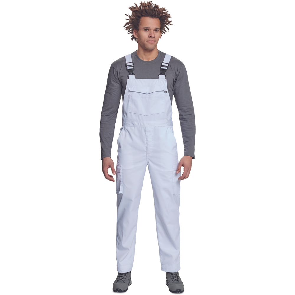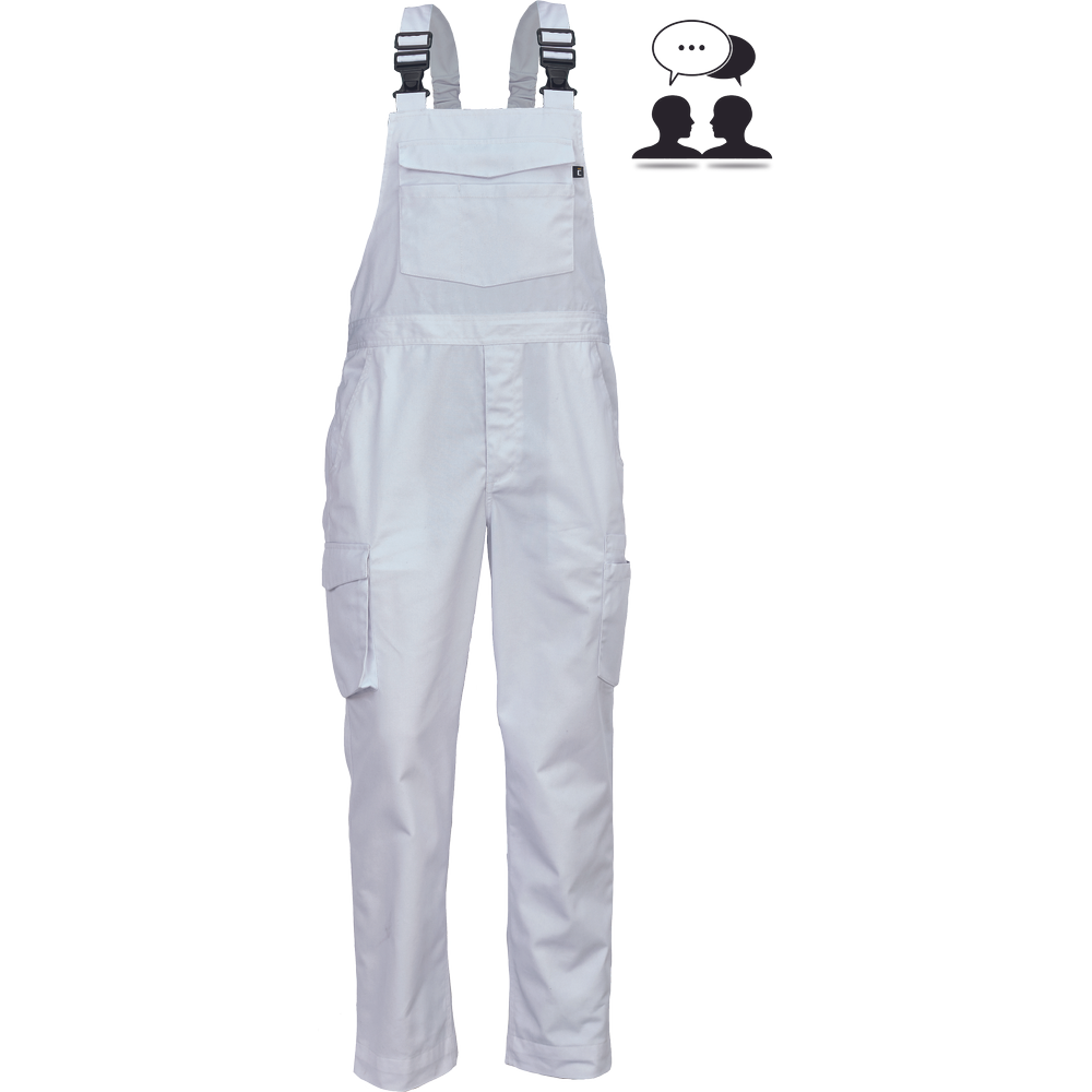 – moške delovne lahke hlače z naprsnikom z elastičnim delom na zadnji strani – 2 stranska žepa, 1 žep za kovance – 2 večnamenska žepa na stegnih, 2 zadnja žepa – 1 velik večnamenski žep za naprsnik – elastični naramnice z zaponko – podaljšljiva dolžina nogavic