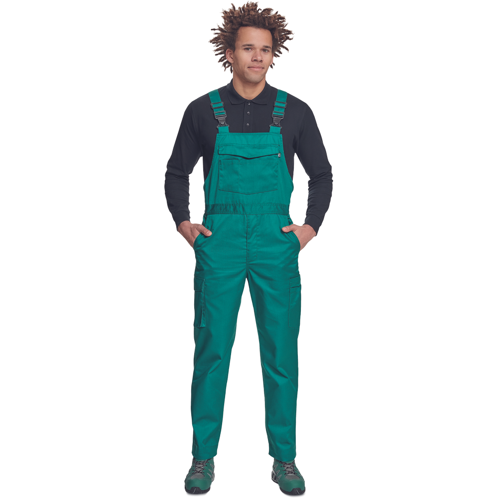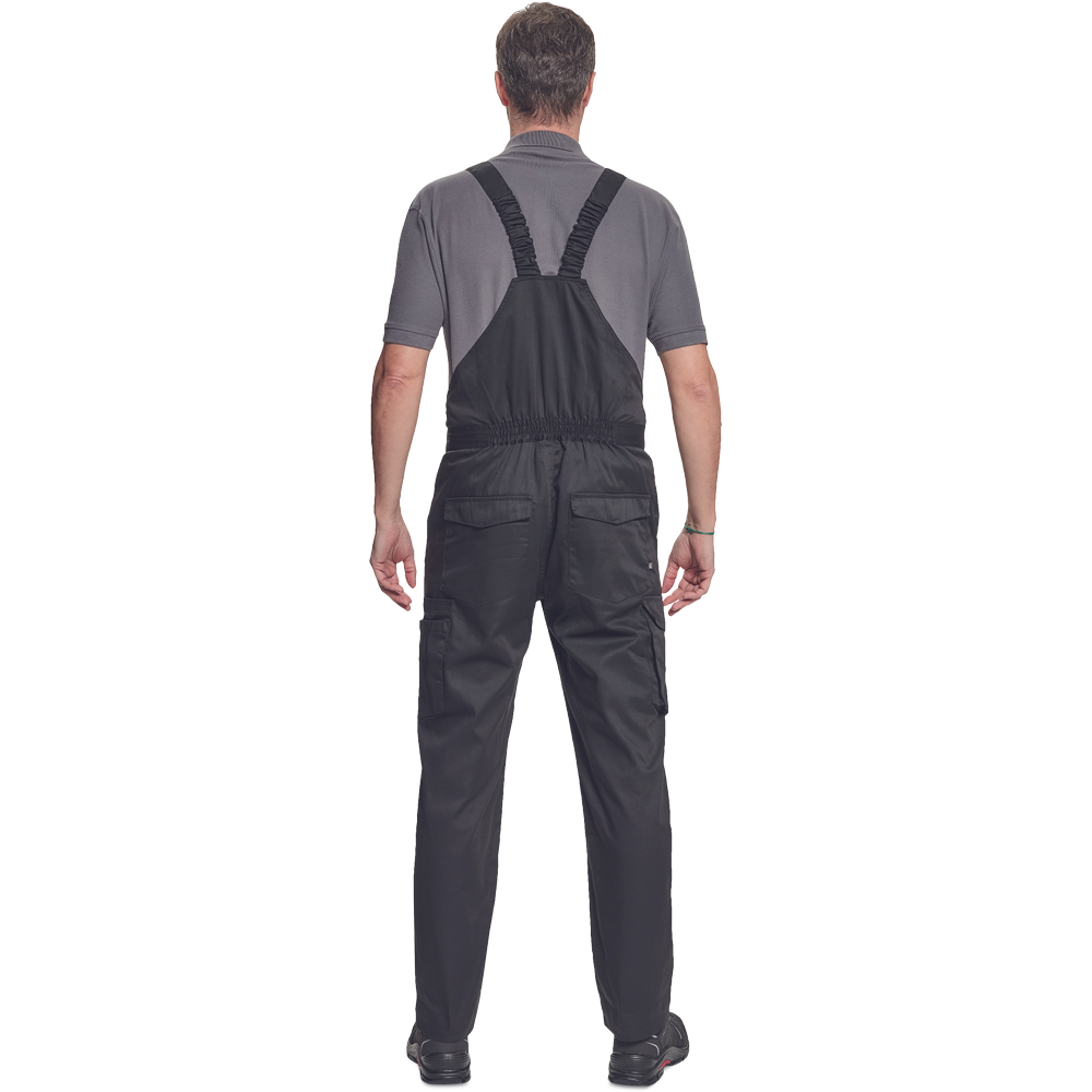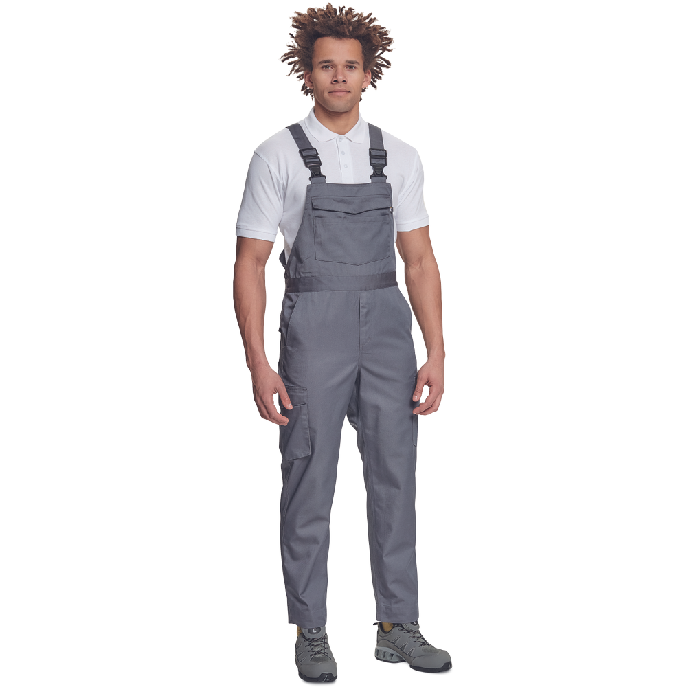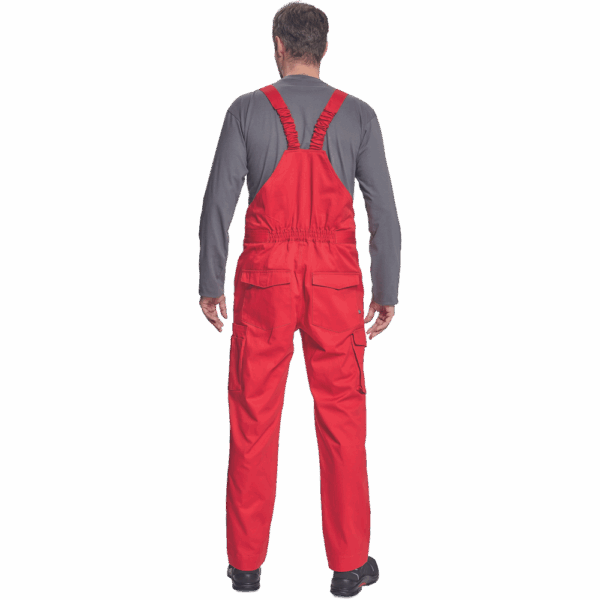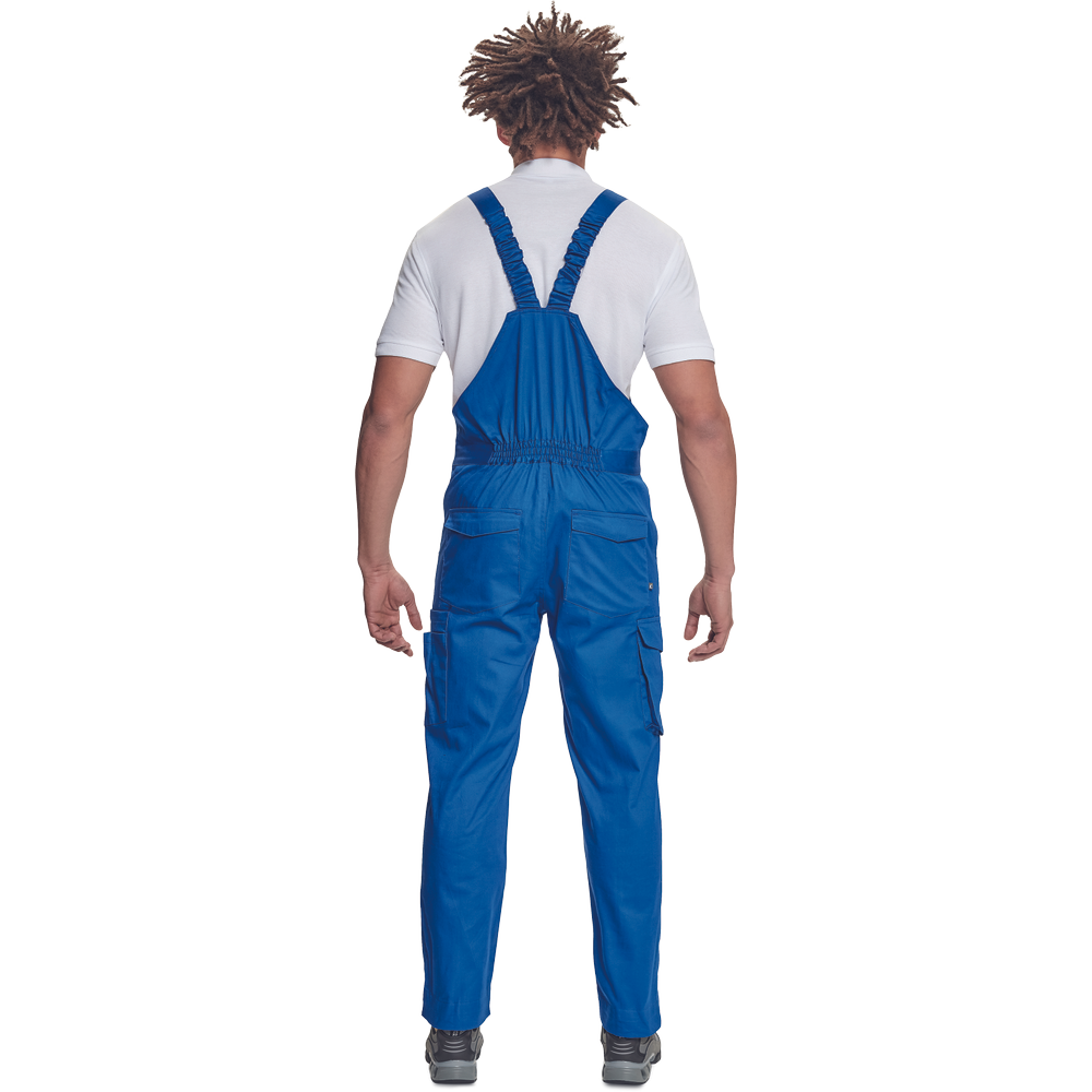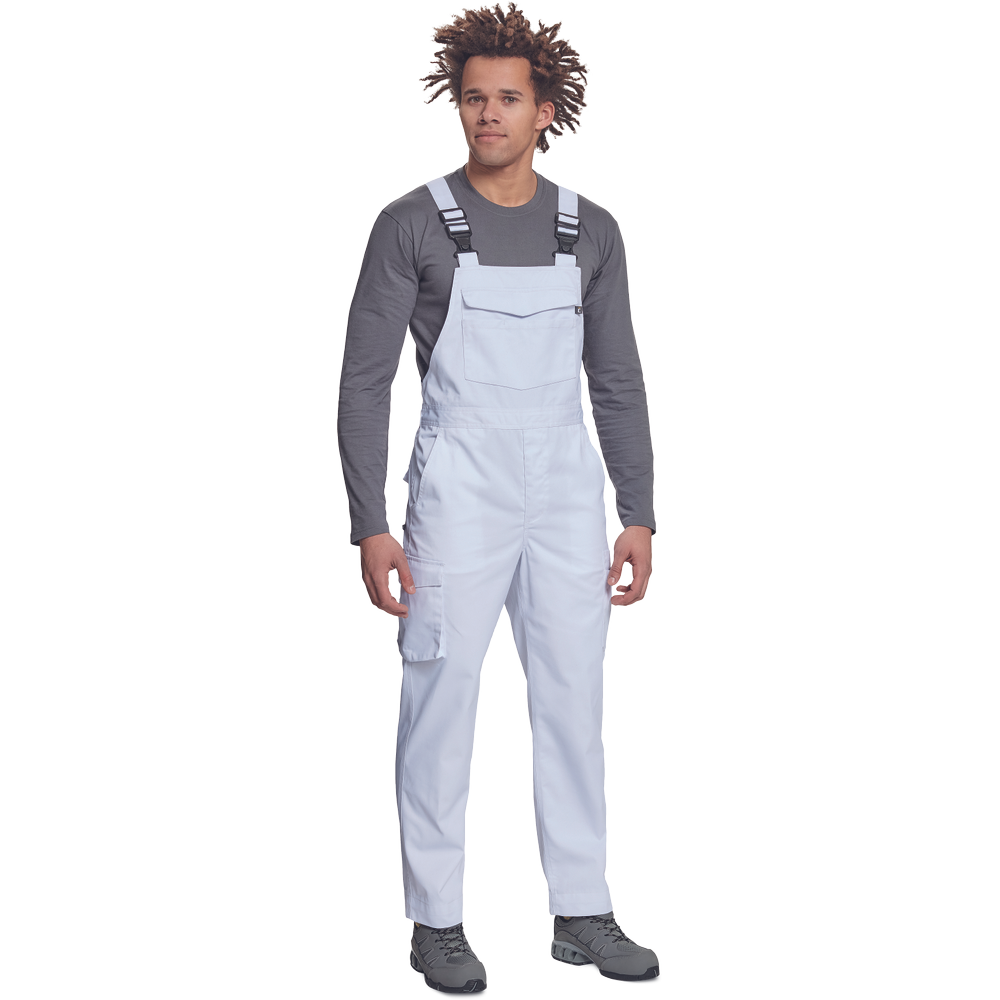 – moške delovne lahke hlače z naprsnikom z elastičnim delom na zadnji strani – 2 stranska žepa, 1 žep za kovance – 2 večnamenska žepa na stegnih, 2 zadnja žepa – 1 velik večnamenski žep za naprsnik – elastični naramnice z zaponko – podaljšljiva dolžina nogavic