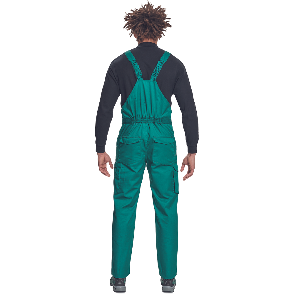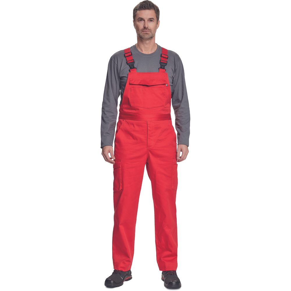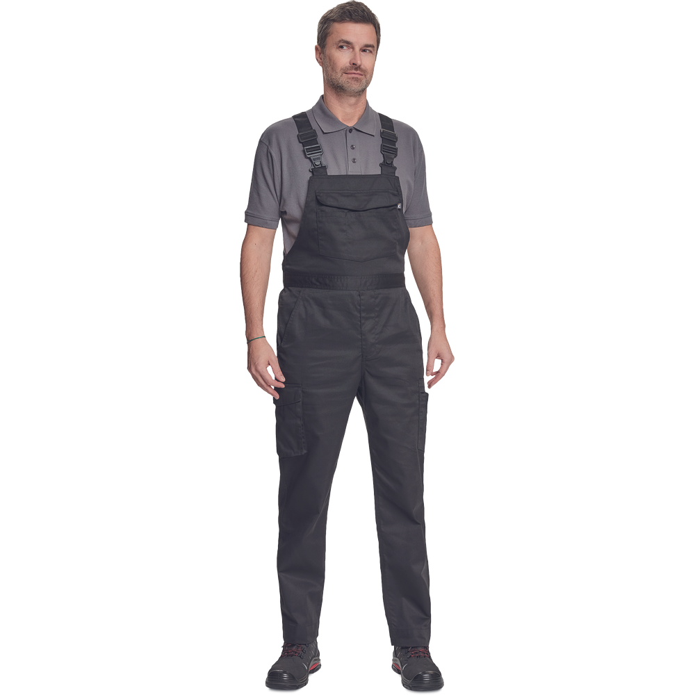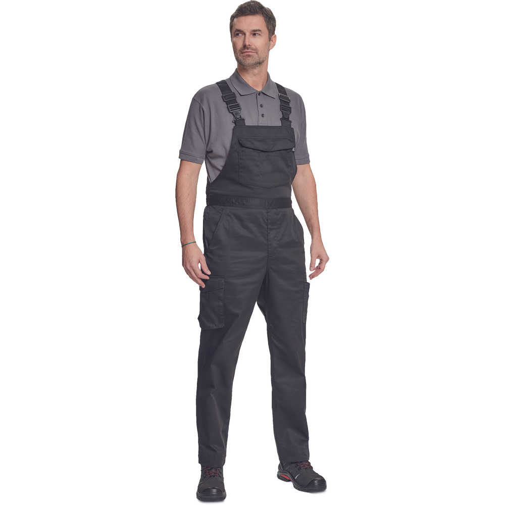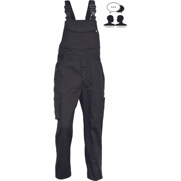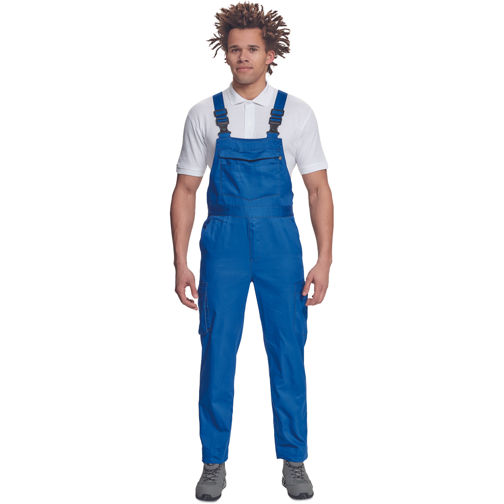 – moške delovne lahke hlače z naprsnikom z elastičnim delom na zadnji strani – 2 stranska žepa, 1 žep za kovance – 2 večnamenska žepa na stegnih, 2 zadnja žepa – 1 velik večnamenski žep za naprsnik – elastični naramnice z zaponko – podaljšljiva dolžina nogavic