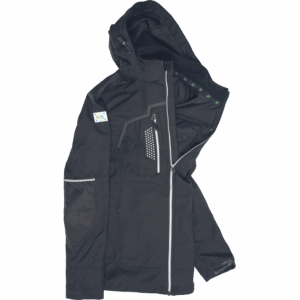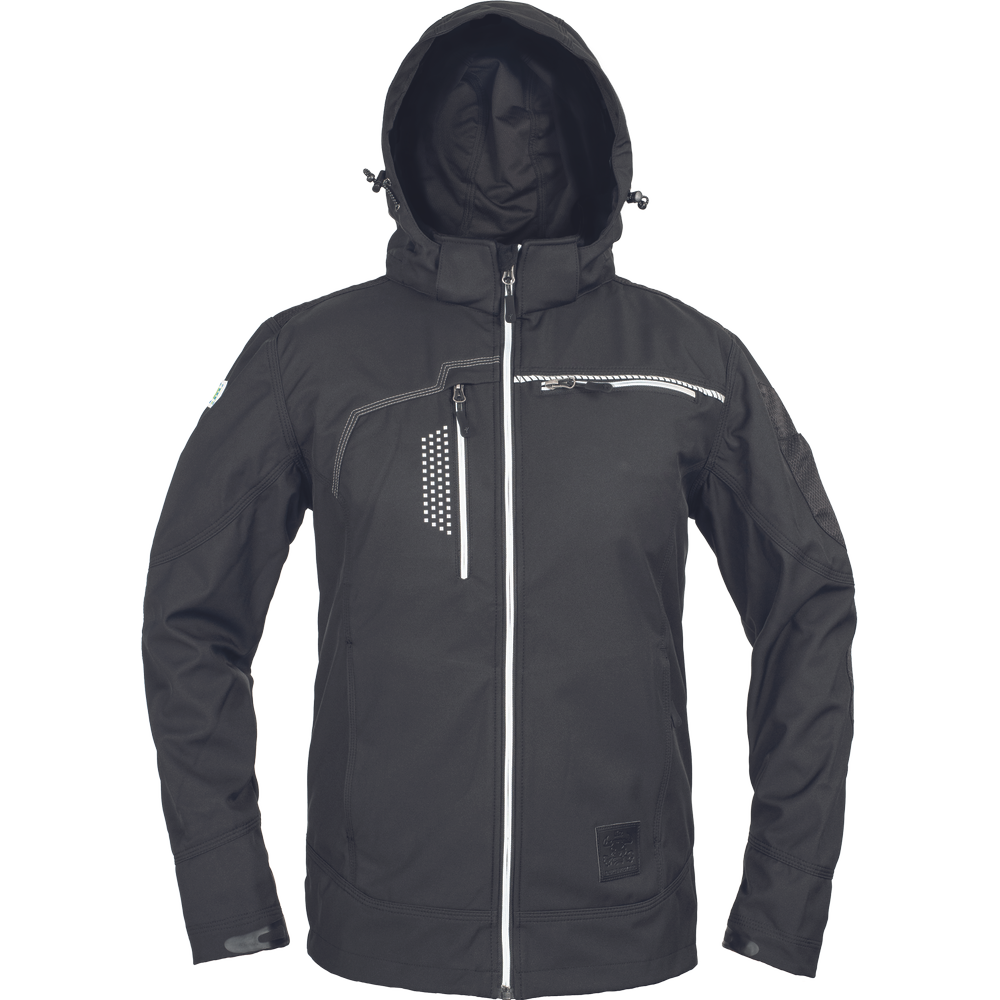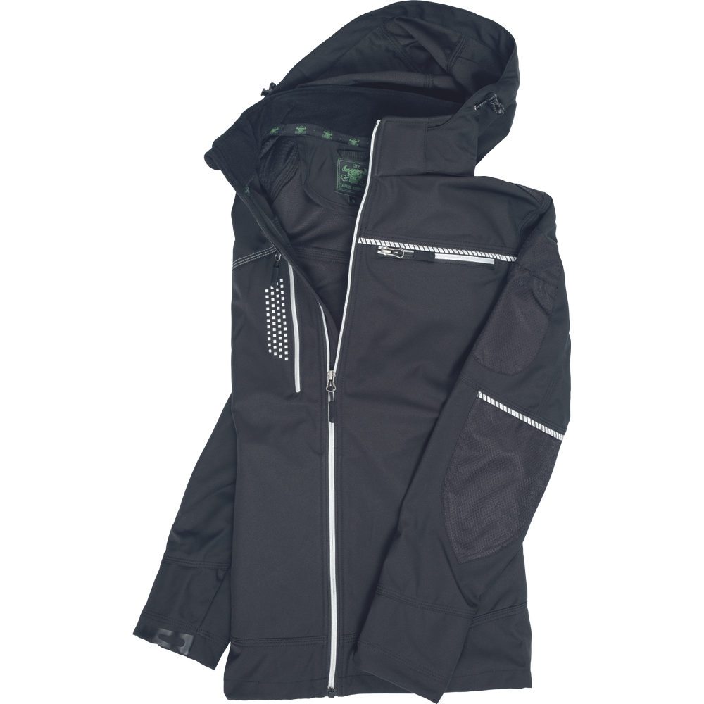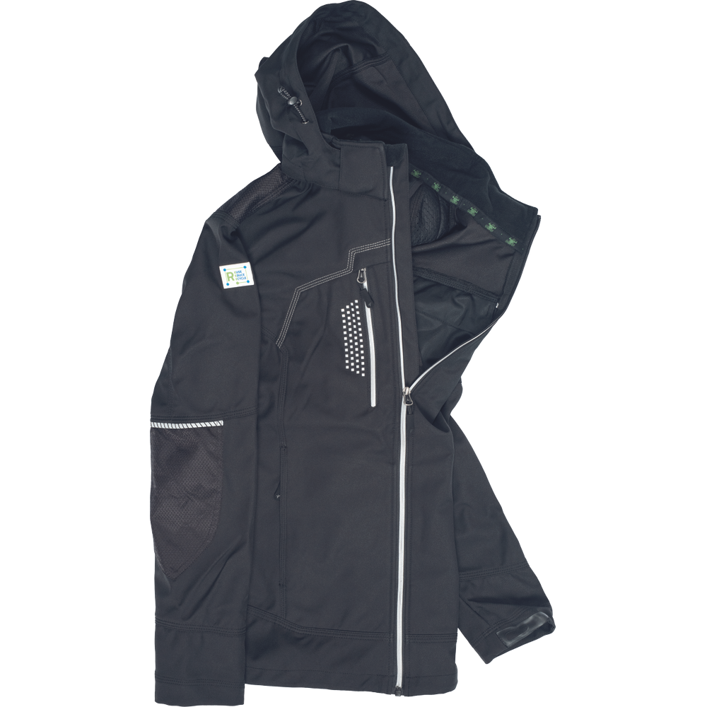 – moška softshell jakna modernega kroja – refleksna zadrga spredaj na sredini – Napoleonov žep z zadrgo na desni strani (refleksna zadrga) z odprtino za slušalke – Cordura ojačitev na ramenih in tudi na komolcih – kontrastni šiv v svetlo sivi barvi – kapuca na zadrgo – prekinjene signalne cevi in signalni našitek za varnost in učinek – zavihek z napisom imena na levem prsnem žepu
