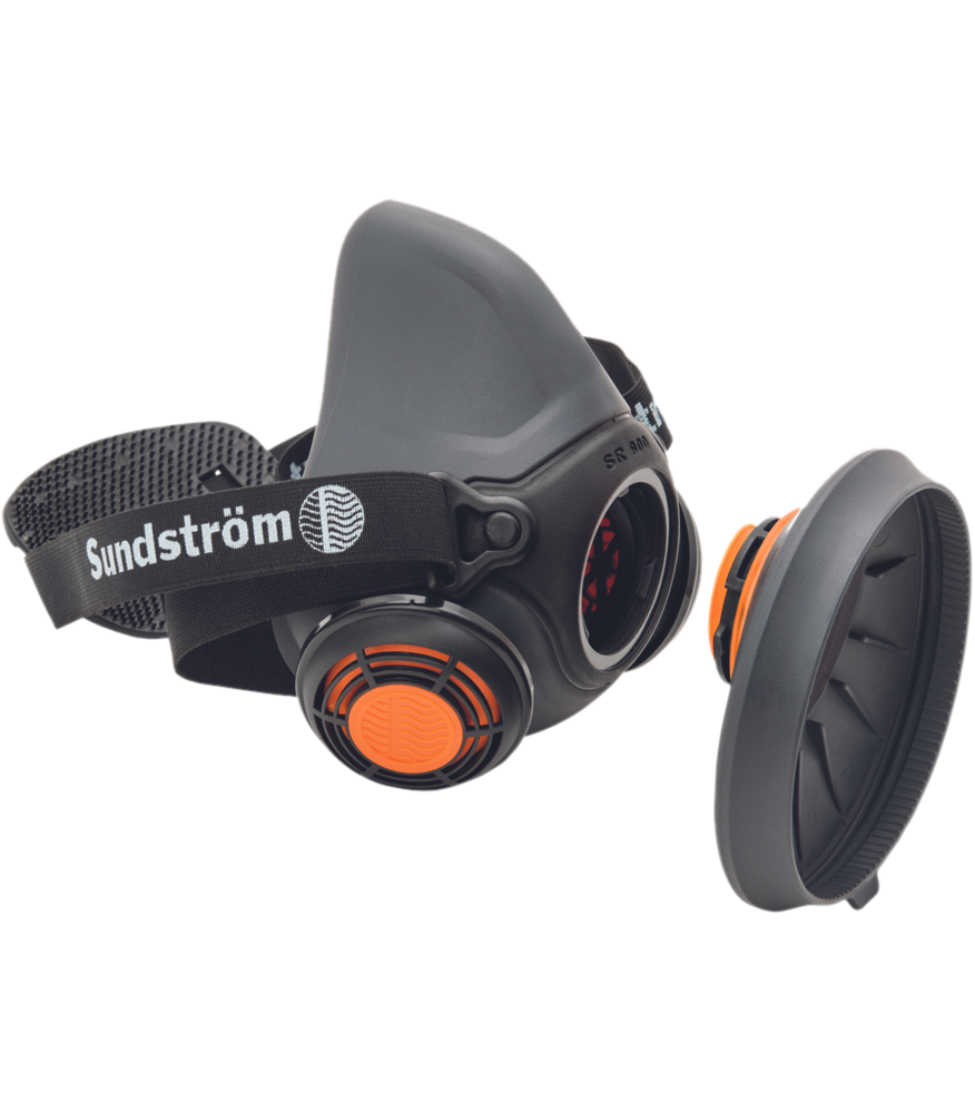 Polobrazna maska SR 900 je izdelana iz termoplastičnega elastomera (TPE) in polipropilena (PP) v treh velikostih: S, M in L. Maska je opremljena z dvema izpihovalnima ventiloma, ki zagotavljata zelo majhen upor pri izpihovanju. Pokrovi ventilov s pregradami učinkovito ščitijo izdihovalno membrano pred prahom in barvno meglico. Material in pigment telesa maske je FDA odobrila za živila, kar zmanjšuje tveganje za nastanek kontaktnih alergij. Elastični trakovi maske z enostavno nastavljivim naglavnim pasom so oblikovani kot zanka v obliki črke V in imajo veliko diskasto krono ploščico, kar prispeva k udobnemu in varnemu prileganju. Polmaska SR 900 se uporablja v kombinaciji z: – Filtri iz linije Sundström. – Daljinsko držalo filtra SR 905 v skladu s standardom EN 12083. – SR 307 ali SR 507, ki služi kot dihalni aparat z neprekinjenim pretokom za priključitev na oskrbo s stisnjenim zrakom v skladu s standardom EN 14594:2005. – Ventilatorska enota SR 500/SR 700 in odobreni filtri, vključeni v sistem Sundströmove dihalne zaščitne naprave z ventilatorjem, ki je skladen s standardom EN 12942:1998. Priloženo je držalo za predfiltre. Najbolje je shranjen v škatli SR 230 ali kovčku SR 339.
