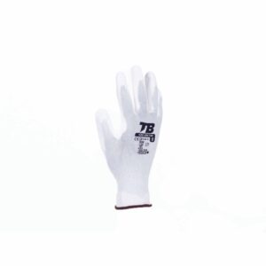– rokavica z belo brezšivno najlonsko podlogo, na dlani premazano z belim PU – poseben PU premaz zagotavlja zaščito pred lepljenjem – pletena manšeta za zapestje – 13 GG