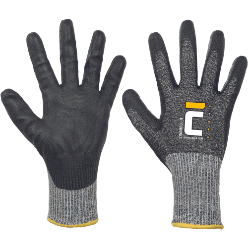 – pletene brezšivne rokavice, na dlaneh in prstih premazane s črnim poliuretanom – najvišja stopnja zaščite pred urezninami F
