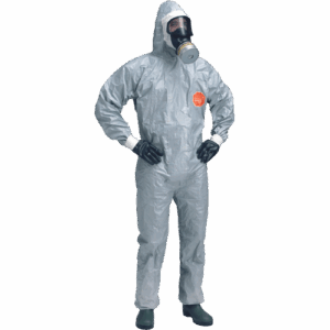 – antistatični vodoodporni kombinezon Tychem F (DuPont) s kapuco in zatesnjenimi šivi – odporen proti koncentriranim anorganskim in organskim kemikalijam ter ultrafinim delcem – spada v kategorijo III, tip 3, 4, 5 in 6