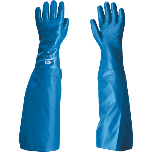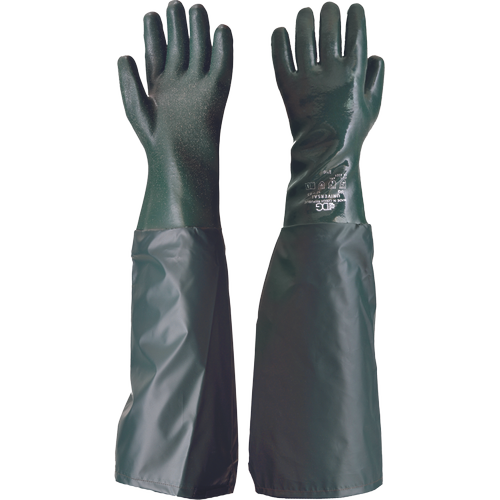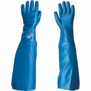 – šivan bombažni interlock, prepojen s PVC in nitrilom – odporen na mehanske in kemične nevarnosti – v skupni dolžini 65 cm (z rokavom) ali 35 cm (brez rokava)